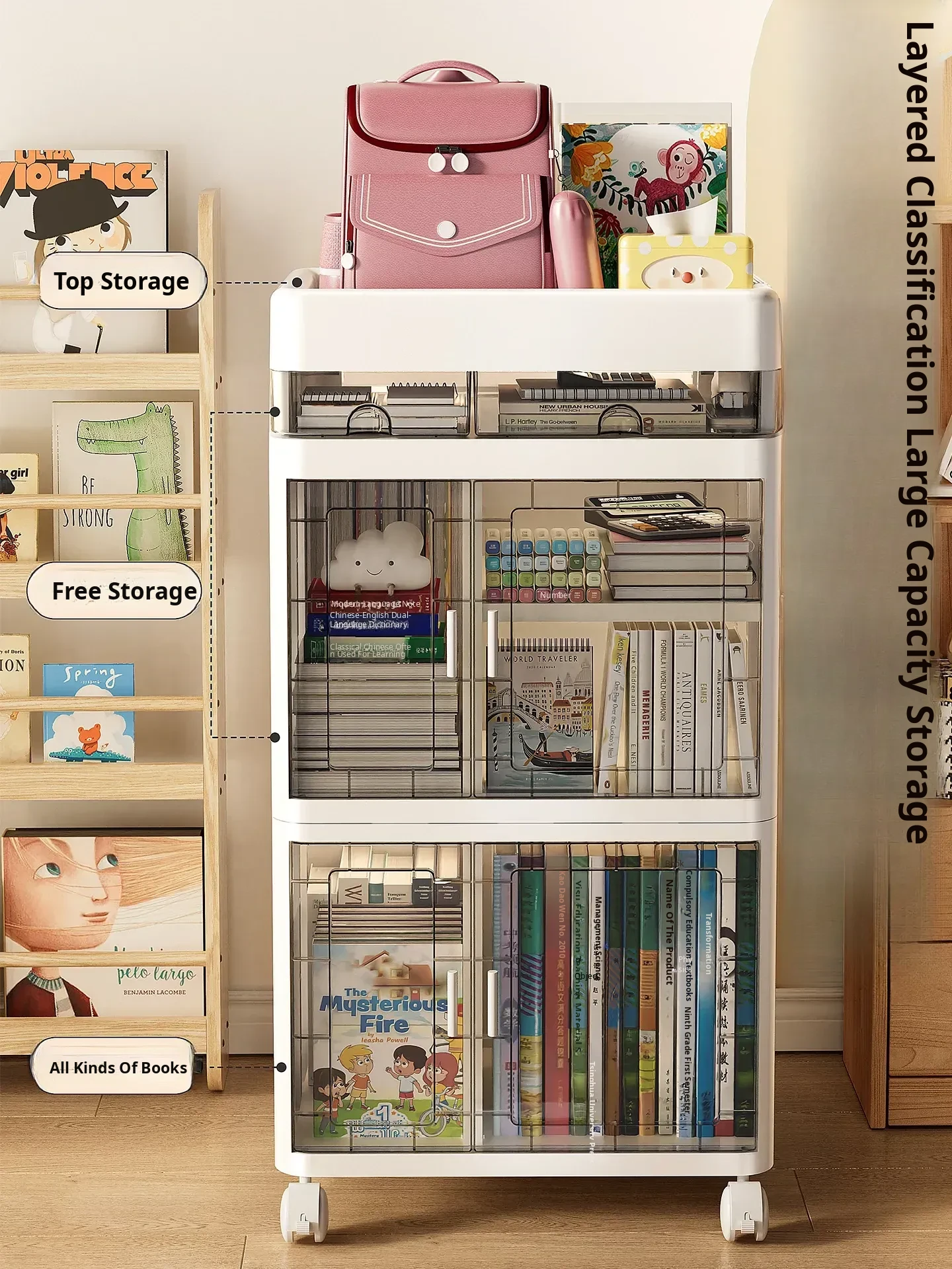 Multifunctional Floor Bookshelf Trolley - Multi-Layer Storage Rack for Students' Backpacks and Books, Ideal for Organizing Picture Books and Textbooks, Perfect for Home or Classroom Use!