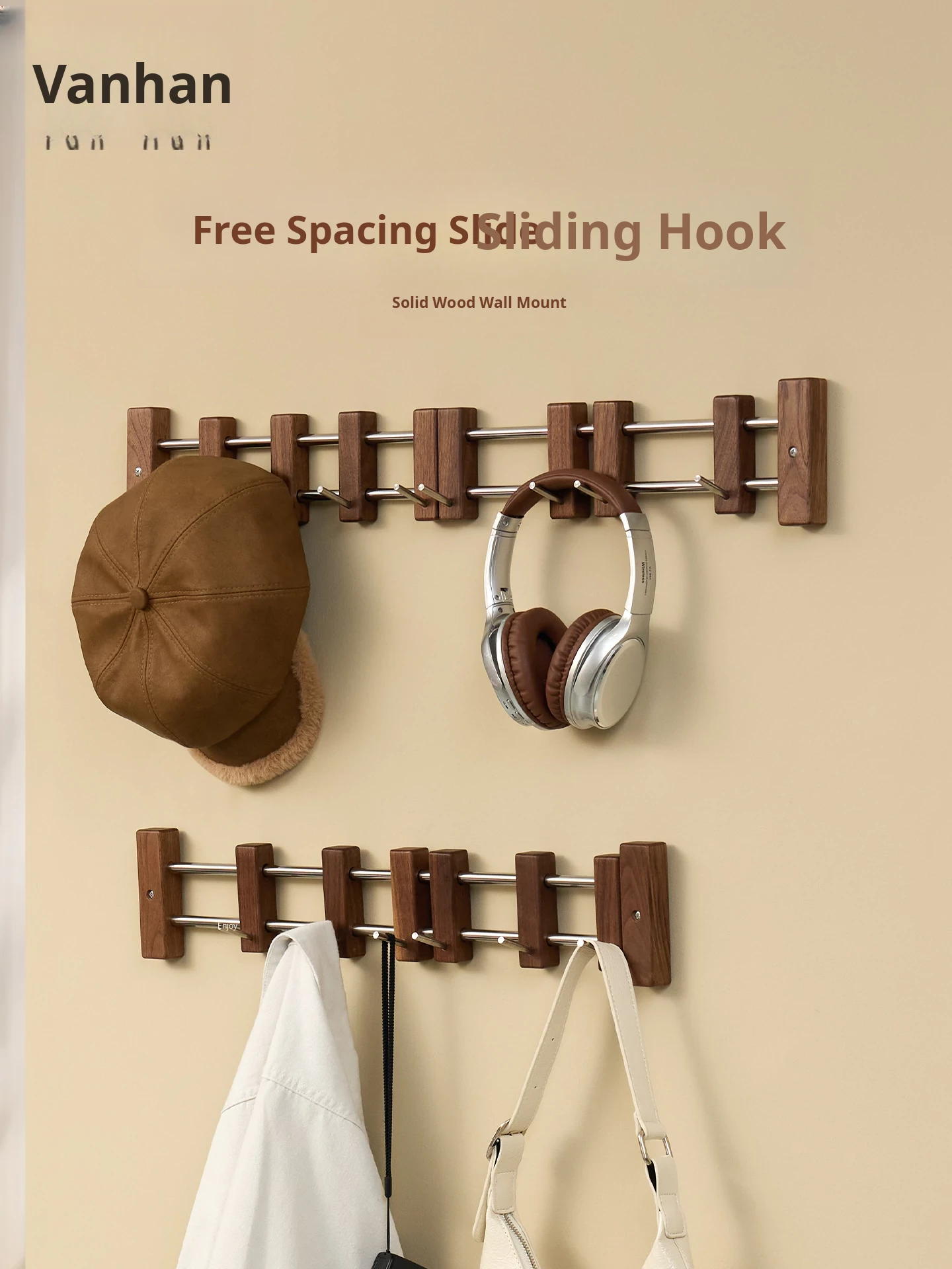 Vanhan Adjustable Wall Hooks - Black Walnut Coat Rack with No-Drill Adhesive for Entryway - Perfect for Hanging Coats, Hats, and Accessories Behind Doors