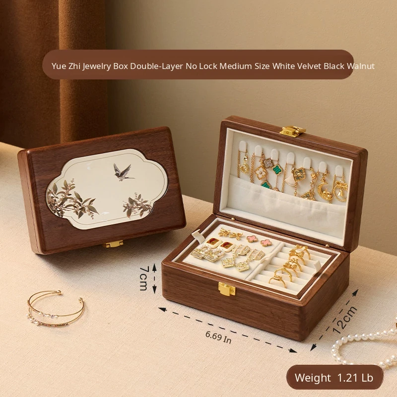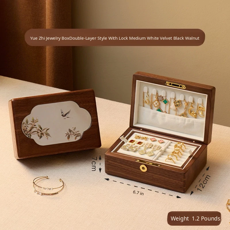 Yuezhi Jewelry Box Window Grille Large Size with Lock Gray Velvet North American Black Walnut [Gift Box]