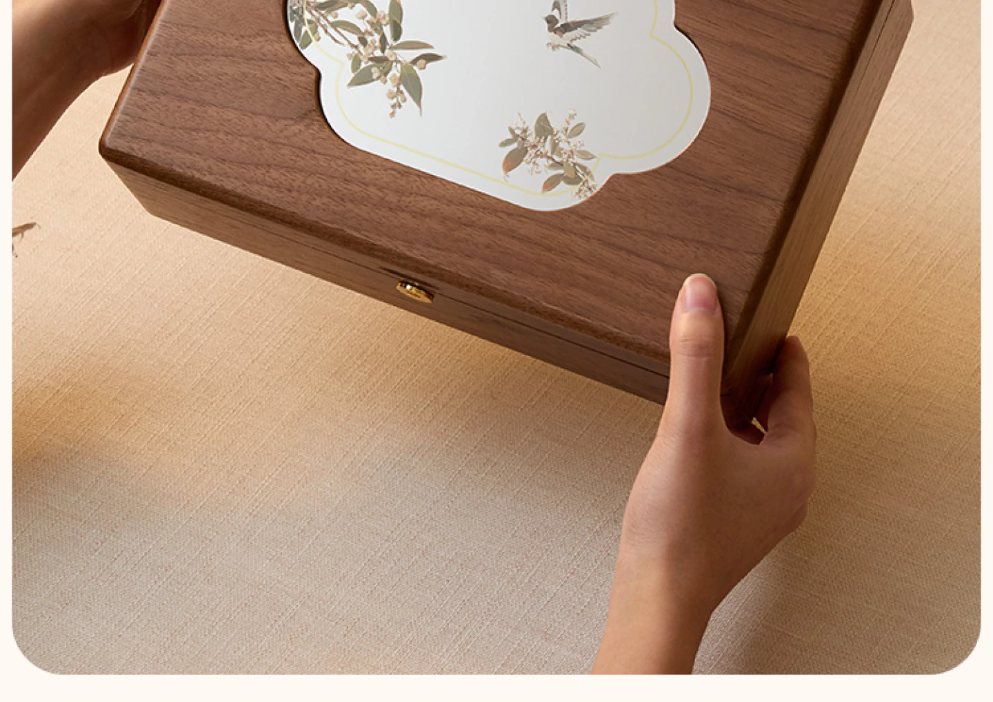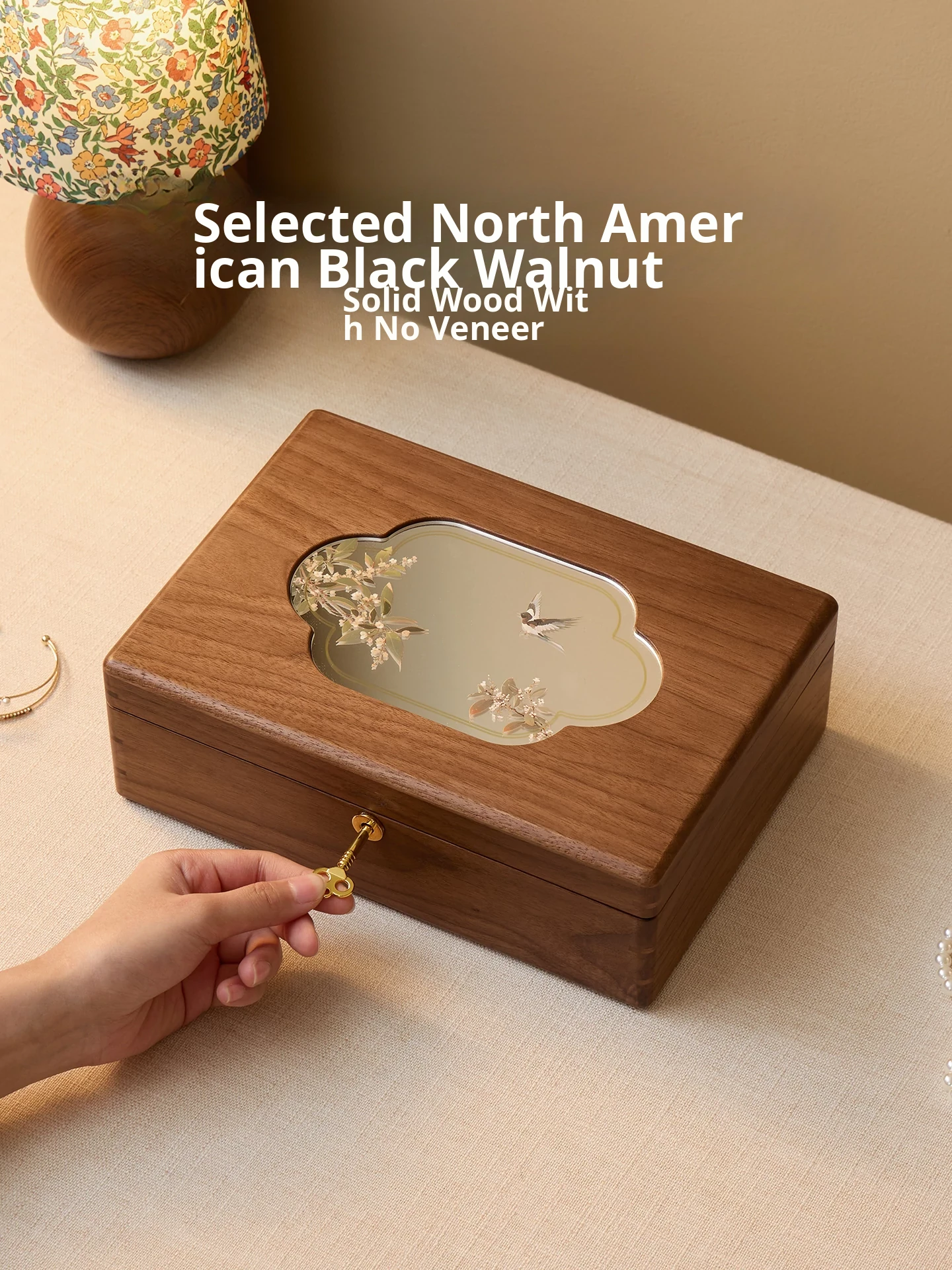 Yuezhi Jewelry Box, Window Lattice Design, Small Size, Lockable, White Velvet Lining, North American Black Walnut Wood