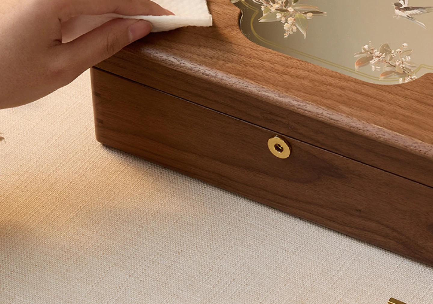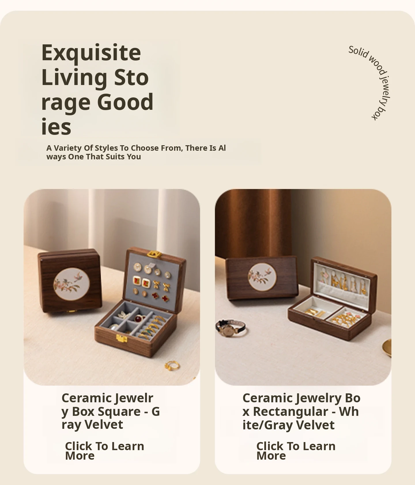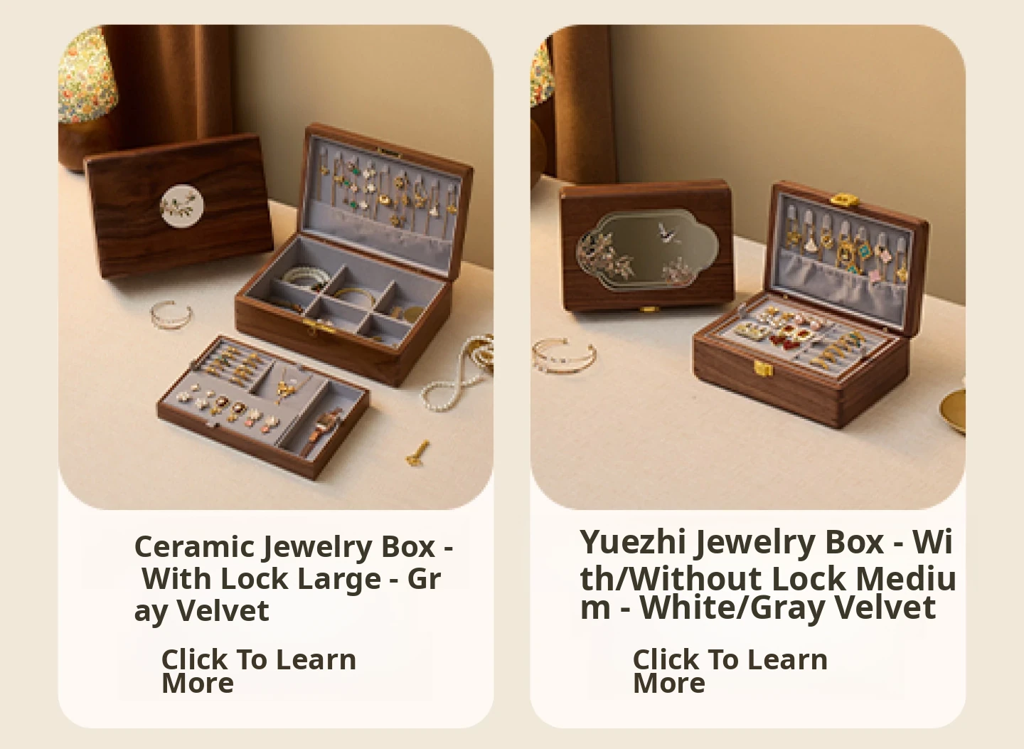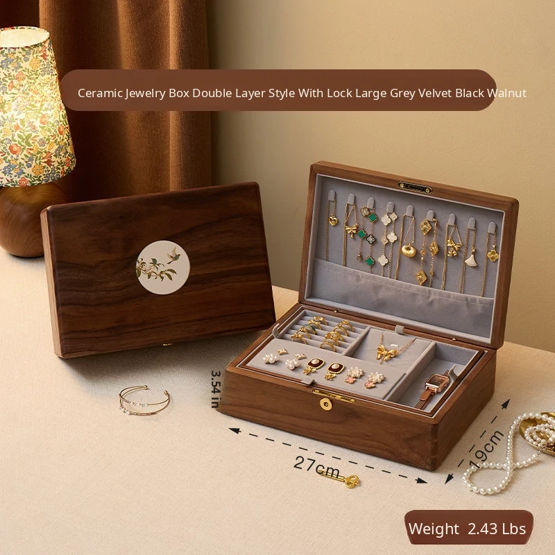 Yue Zhi Jewelry Box - Ceramic, Large Size, Lockable, Gray Velvet Lining, North American Black Walnut Wood