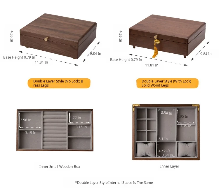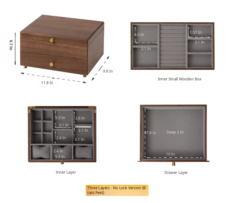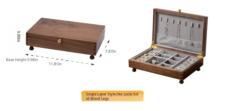 Three-Layer Jewelry Box Without Lock, Gray Velvet, North American Black Walnut