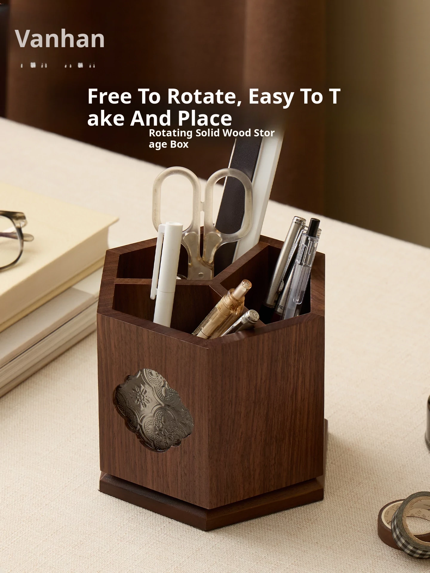 Vanhan Black Walnut Rotating Pen Holder - Vintage Wooden Desktop Organizer with Large Capacity, Chinese Style Solid Wood Storage Box