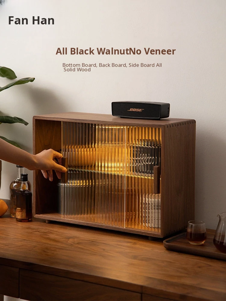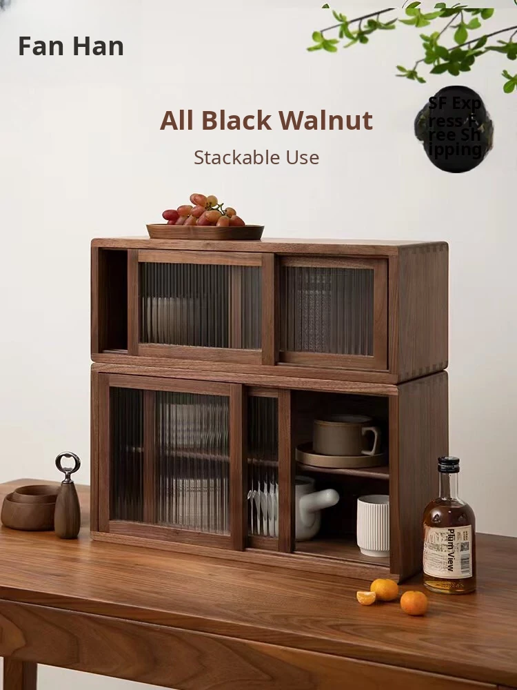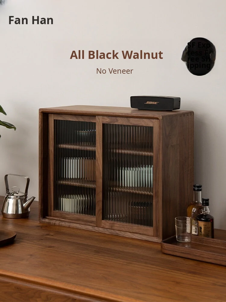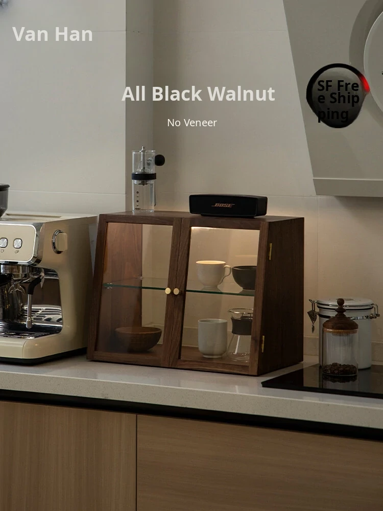 Vintage Solid Wood Storage Cabinet with Doors - Black Walnut Desktop Organizer for Coffee Cups and Tea Sets, Dustproof Design, Stylish and Functional Storage Solution