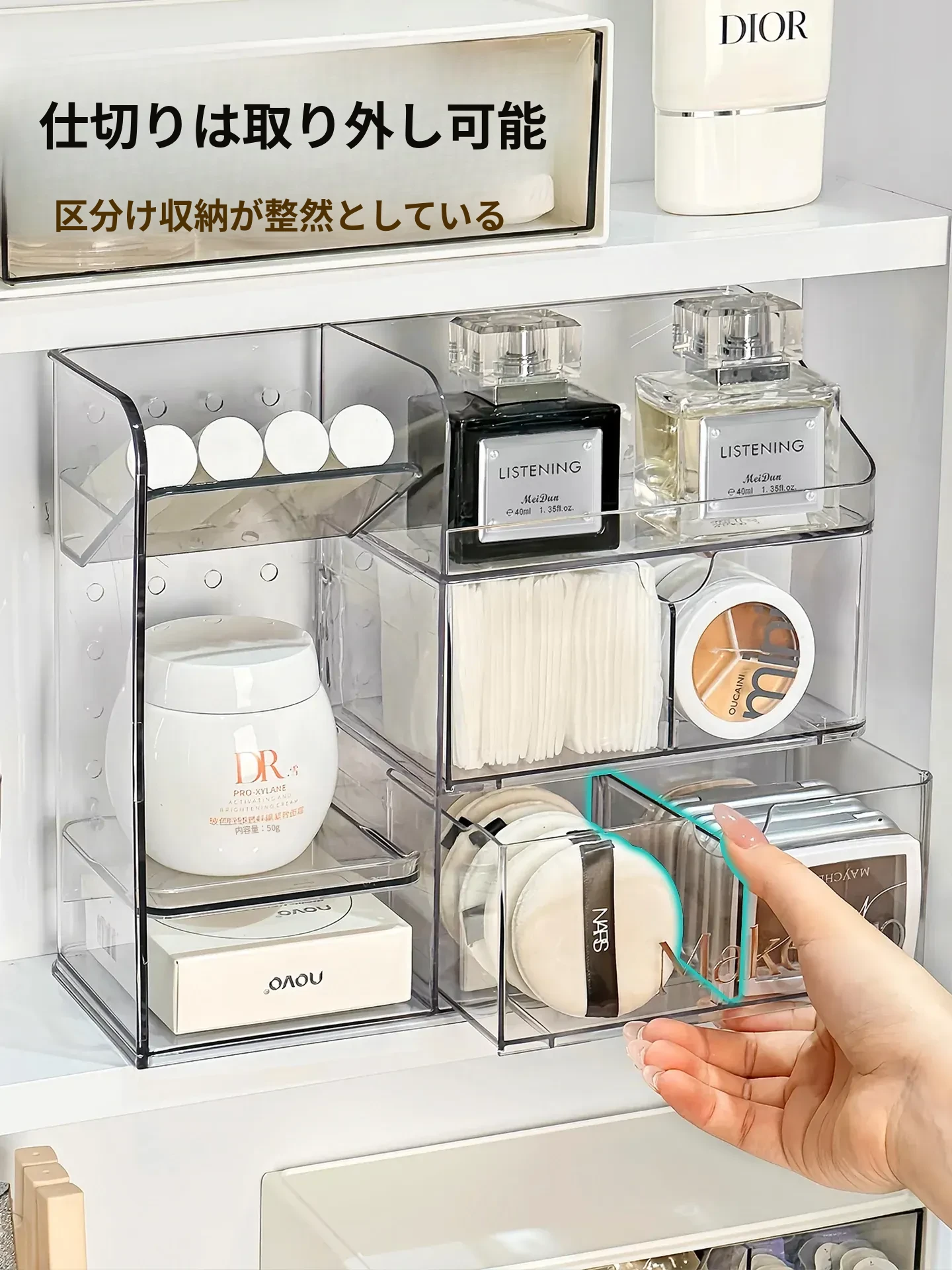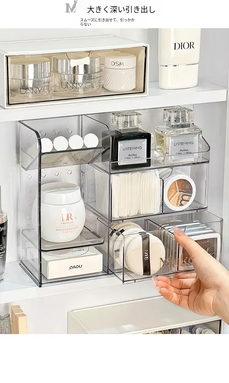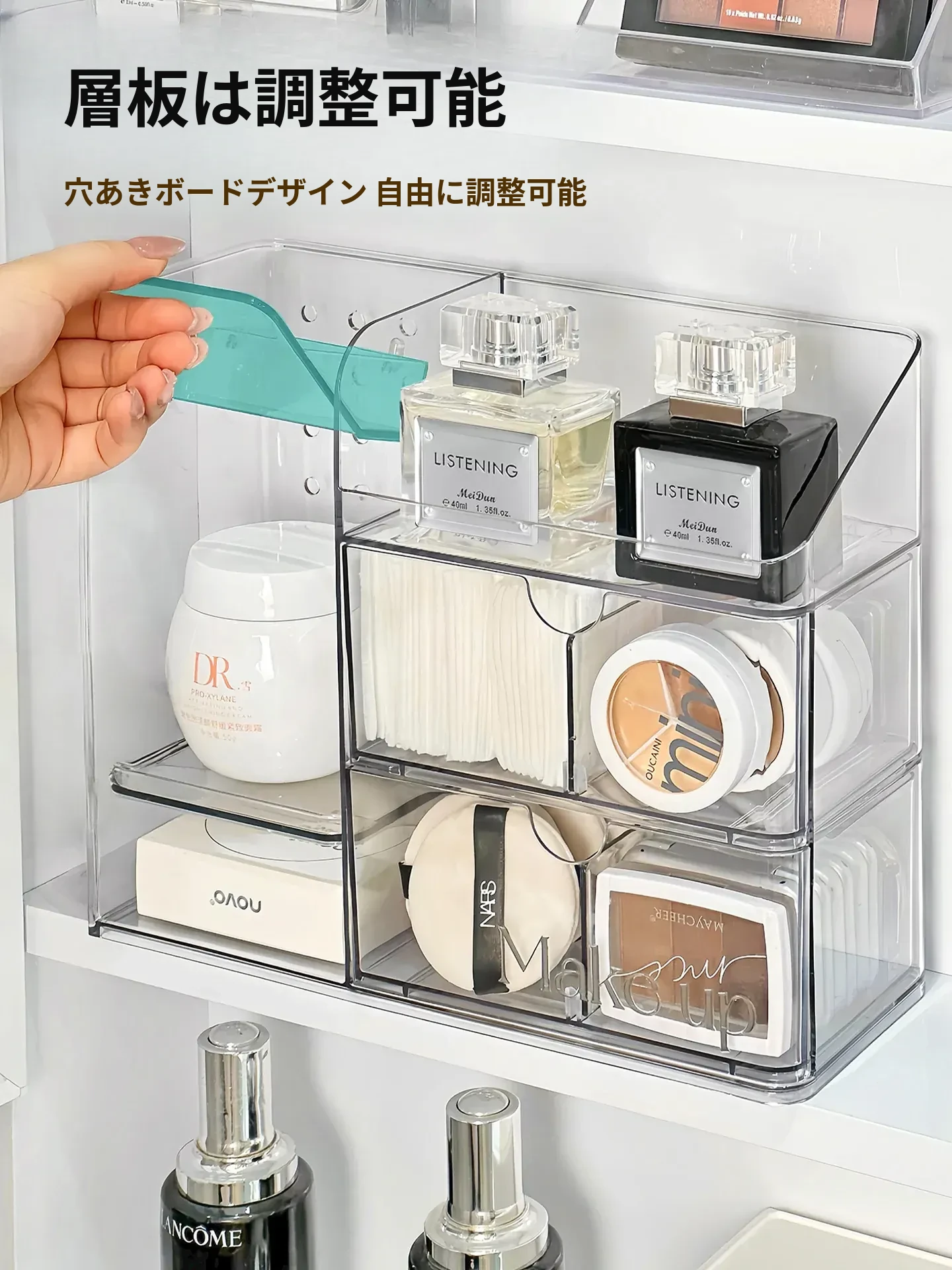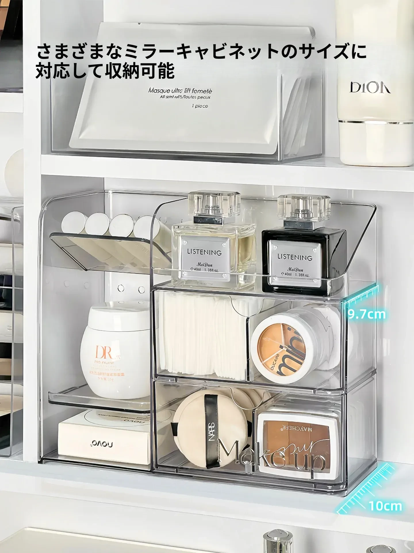 洗面所収納ボックス - 鏡台内蔵の引き出し式仕切り収納ラック!バスルーム化粧品やリップスティックをきれいに整理できる、便利な分層型収納です。あなたの毎日のビューティータイムをもっと楽しく!
