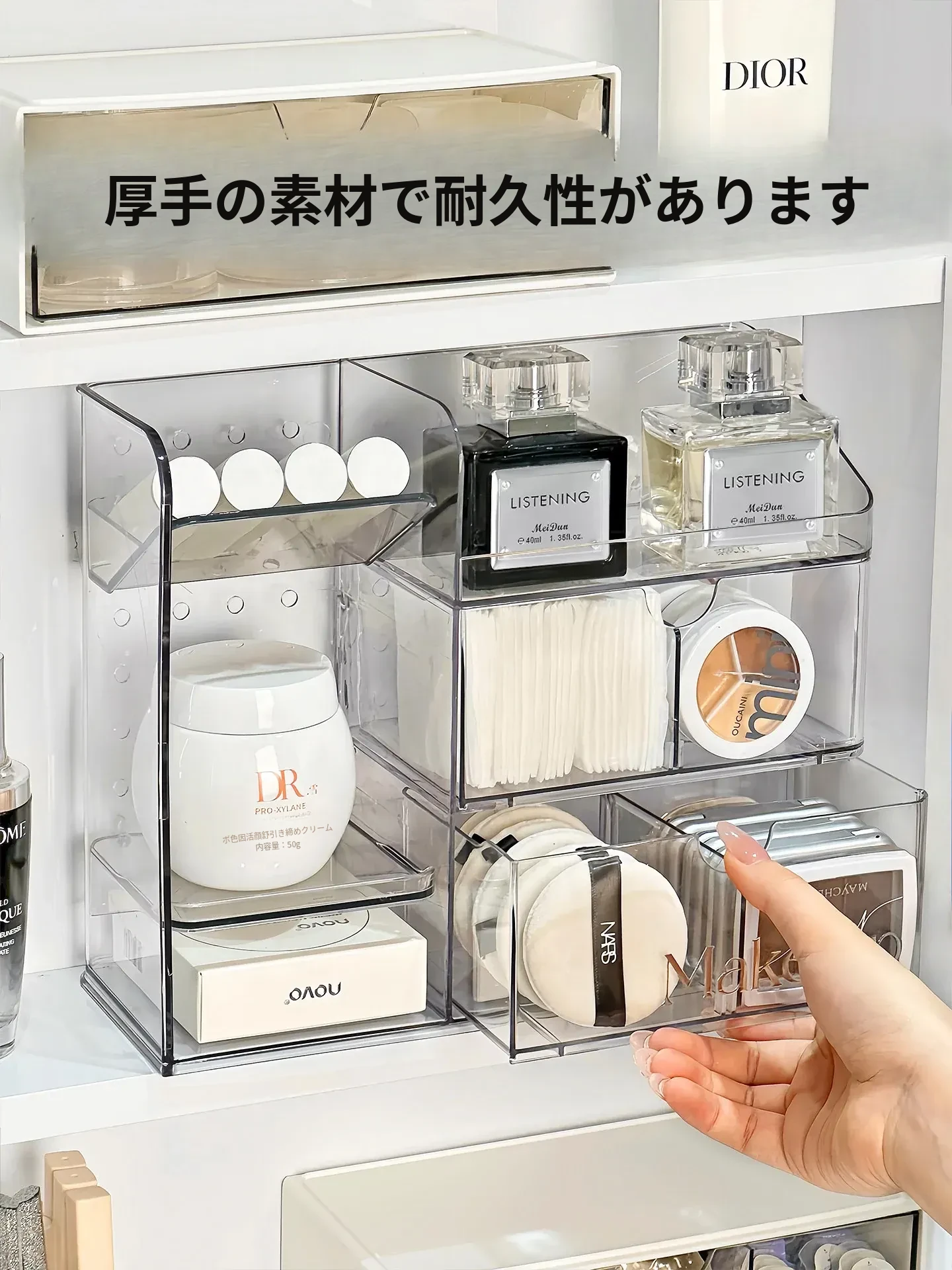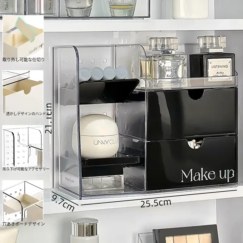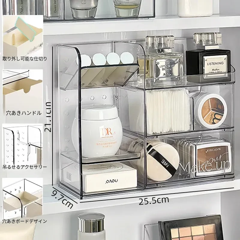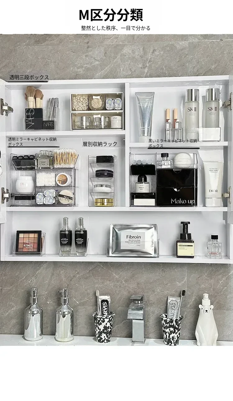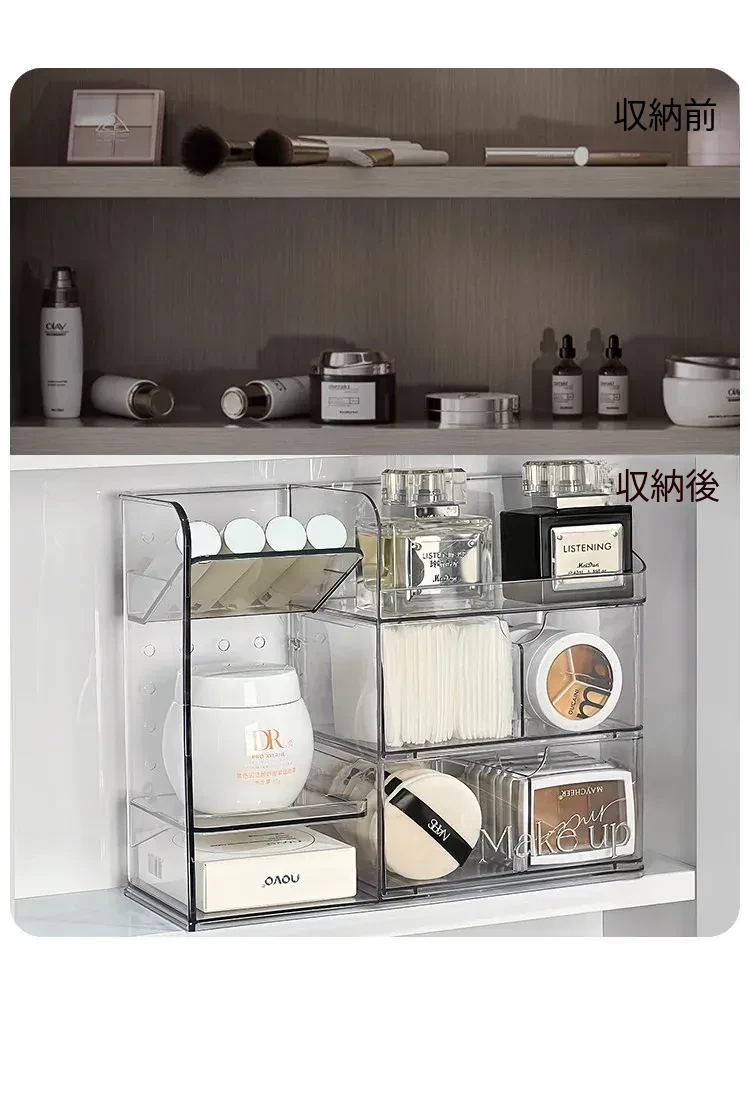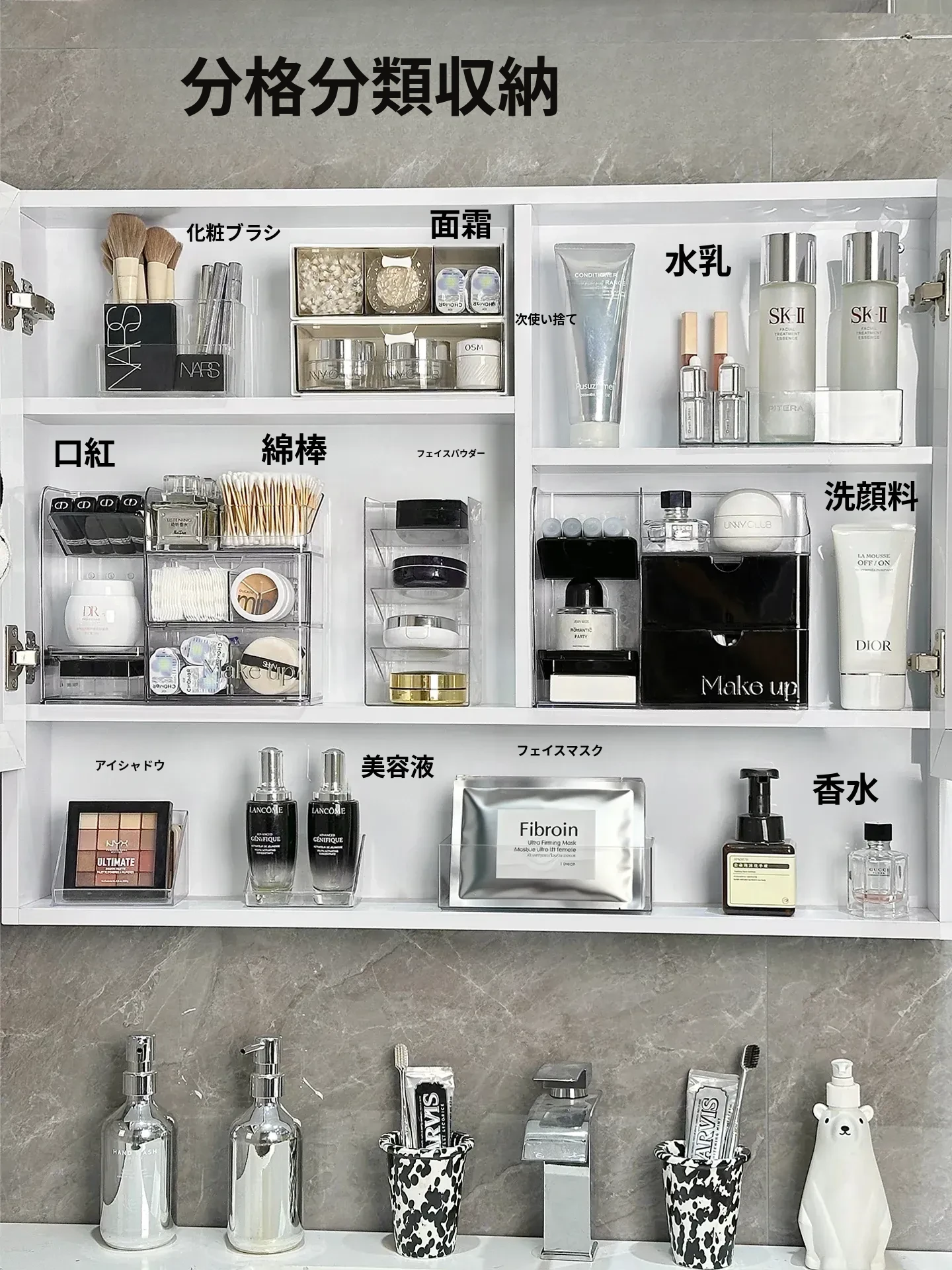 洗面所収納ボックス - 鏡台内蔵の引き出し式仕切り収納ラック!バスルーム化粧品やリップスティックをきれいに整理できる、便利な分層型収納です。あなたの毎日のビューティータイムをもっと楽しく!