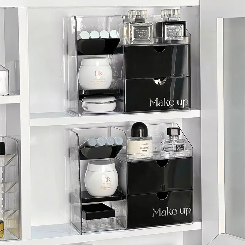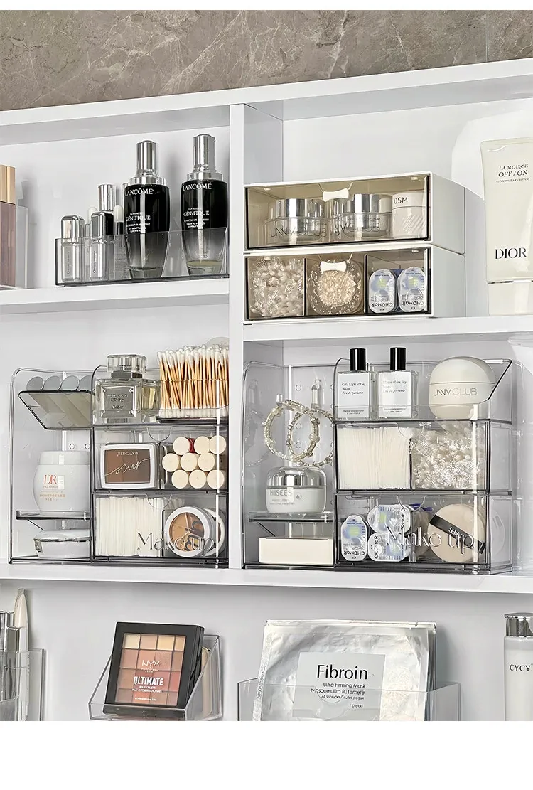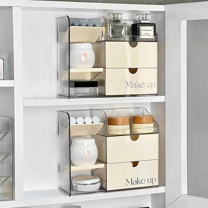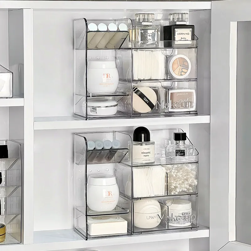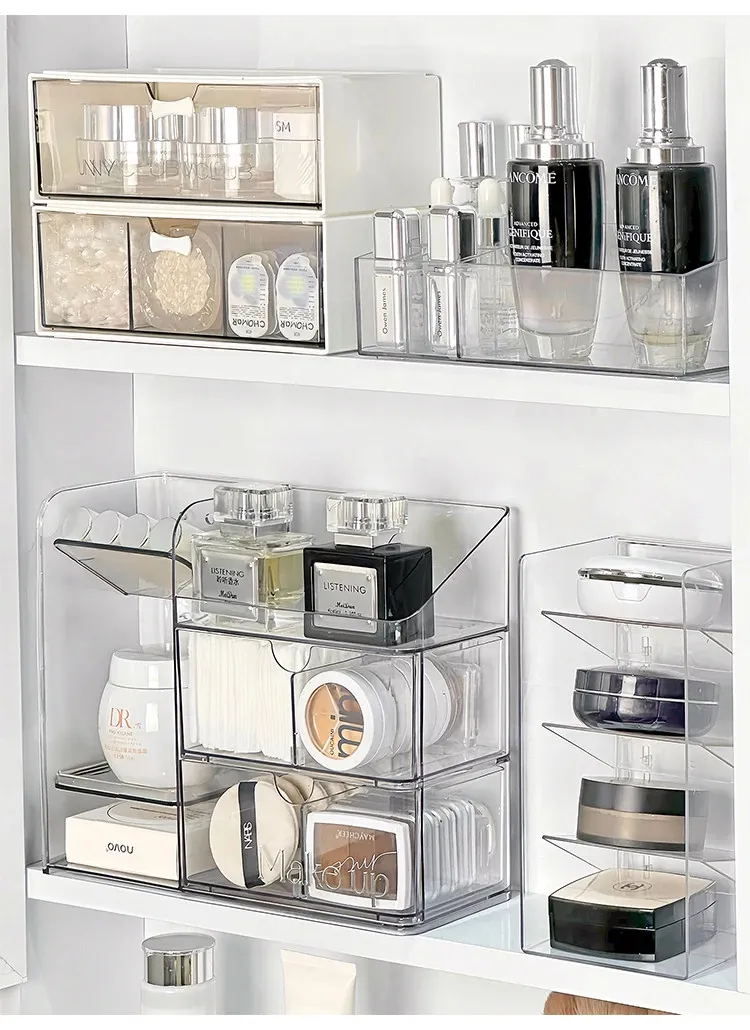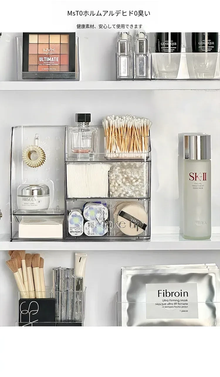 洗面所収納ボックス - 鏡台内蔵の引き出し式仕切り収納ラック!バスルーム化粧品やリップスティックをきれいに整理できる、便利な分層型収納です。あなたの毎日のビューティータイムをもっと楽しく!