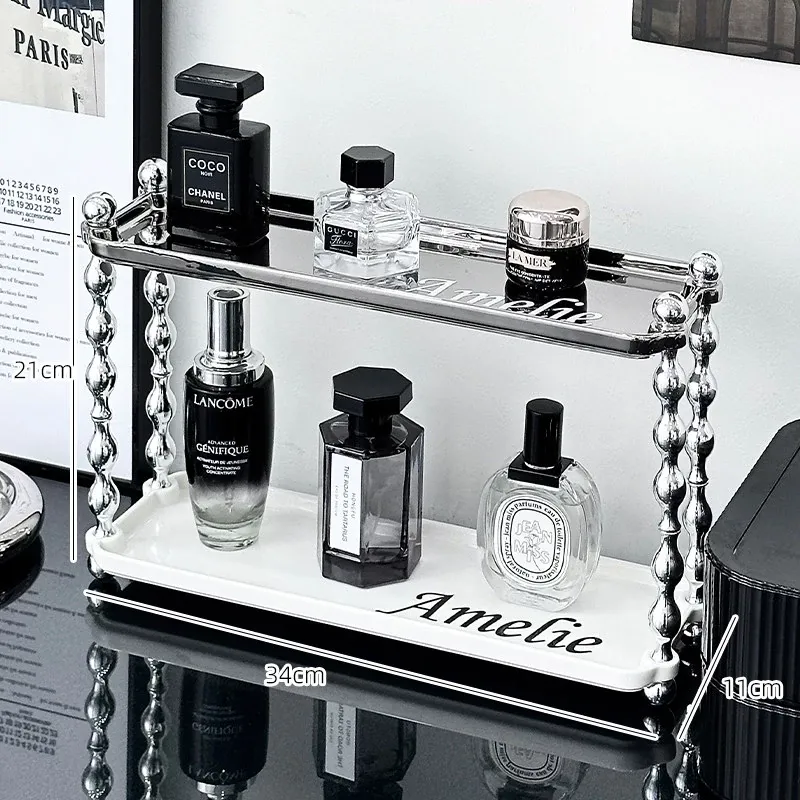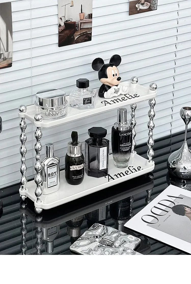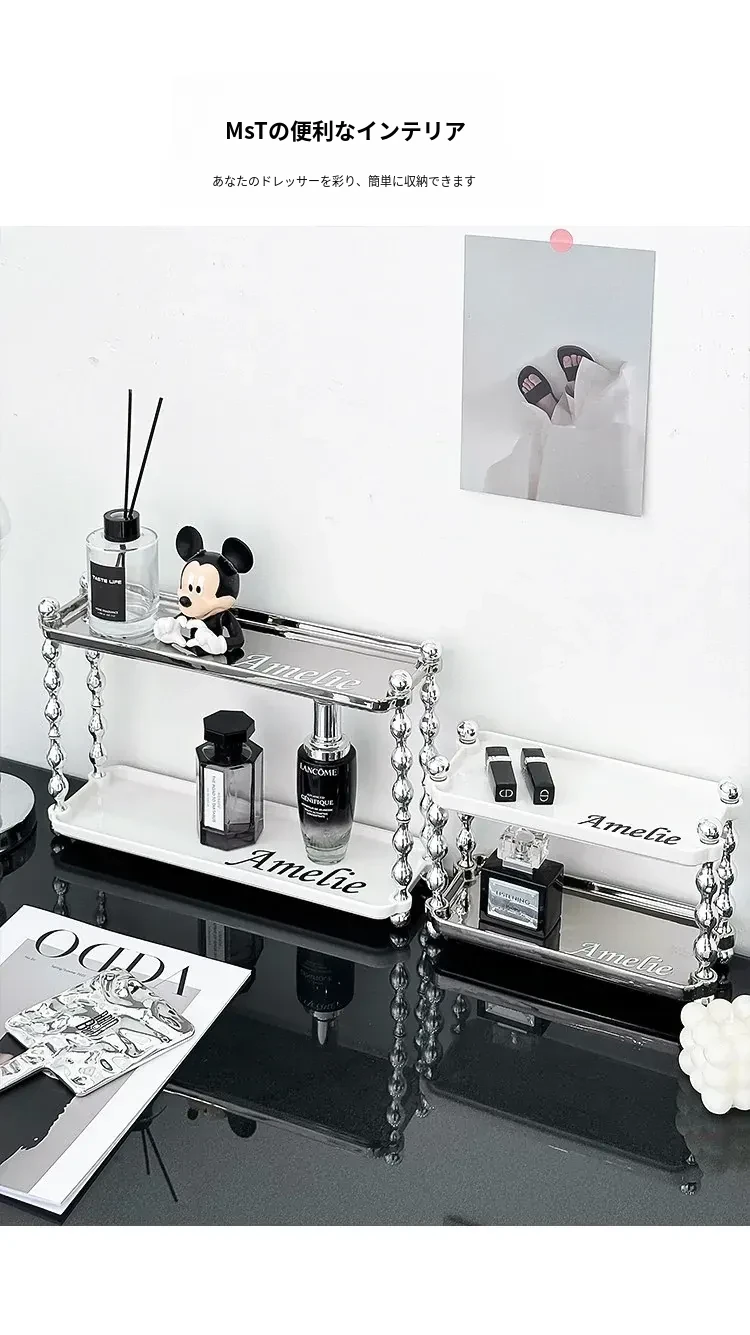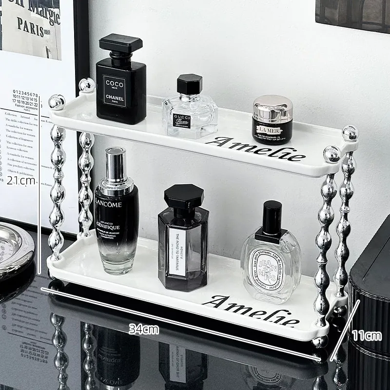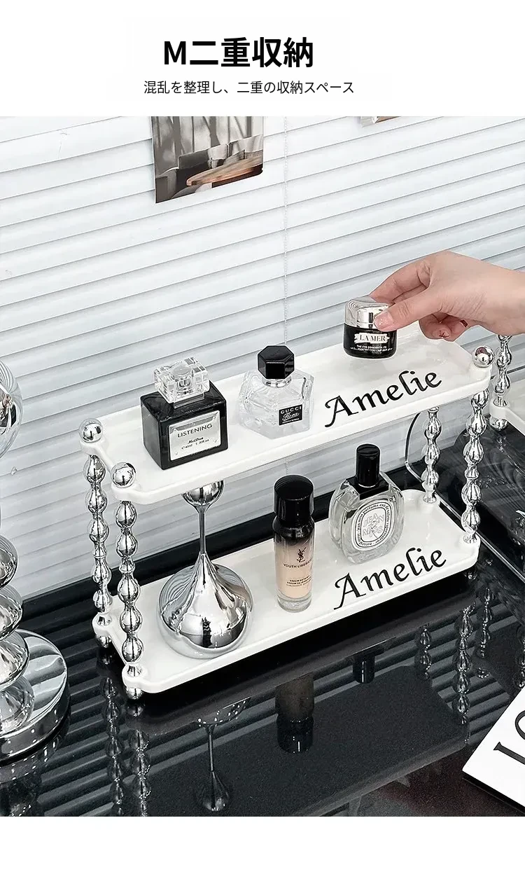 ラグジュアリー感あふれる化粧品収納ラック - ダブルレイヤーのセラミック製で、メイクアップやスキンケア、香水をスタイリッシュに整理!おしゃれなドレッサーにぴったりの高級感あるアイテムです。