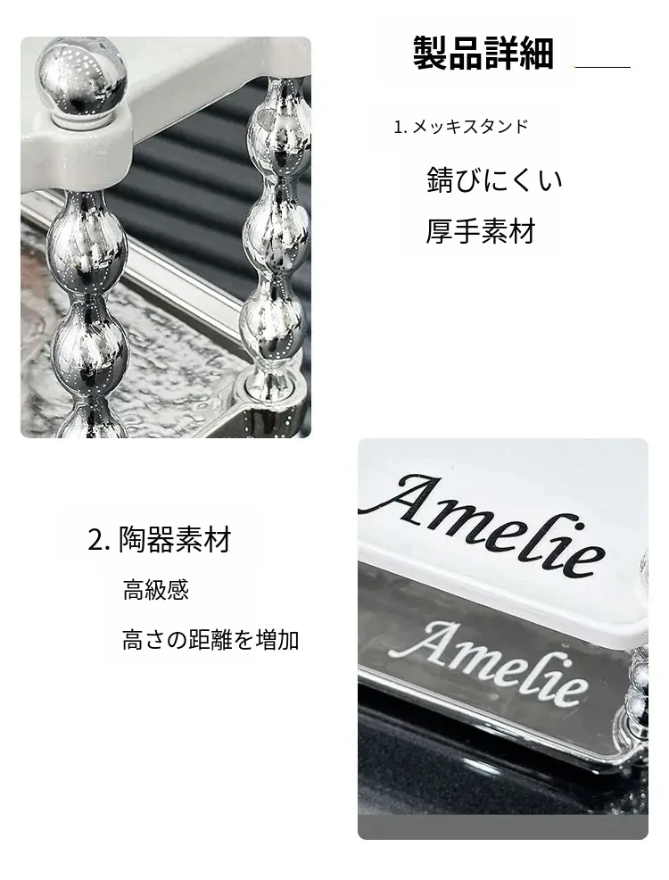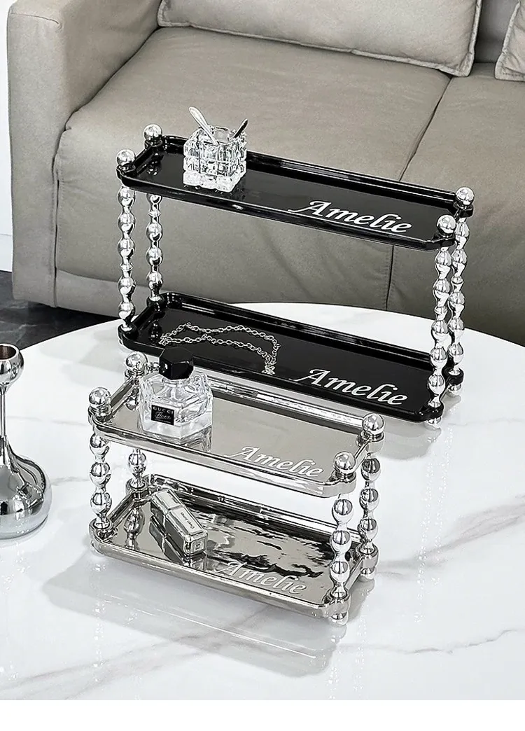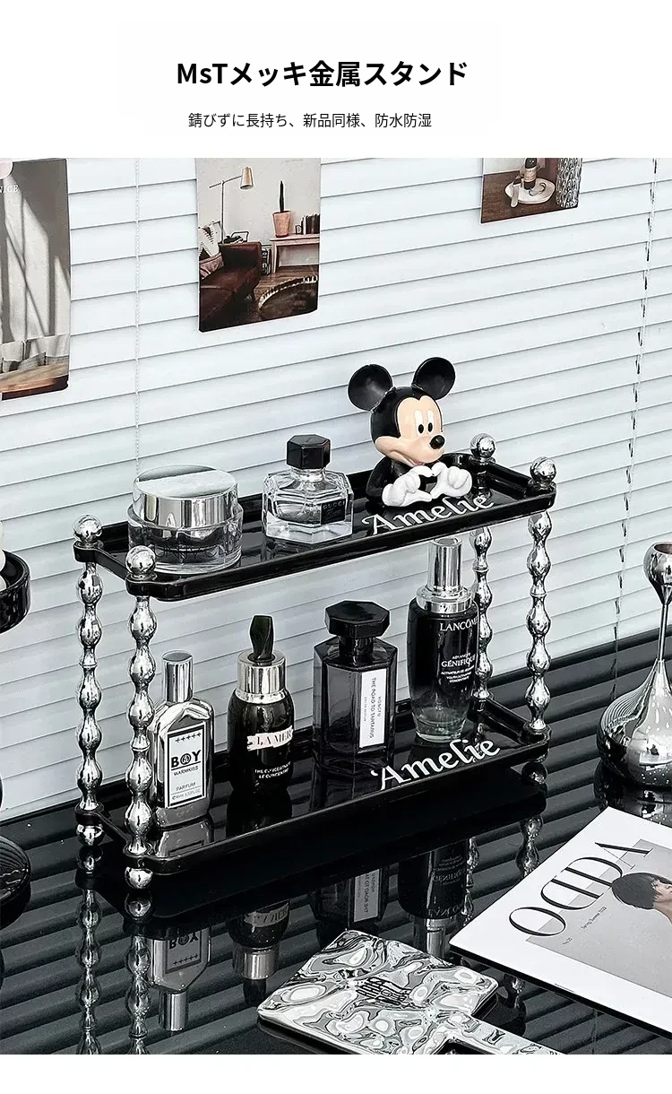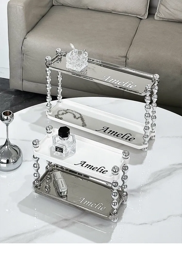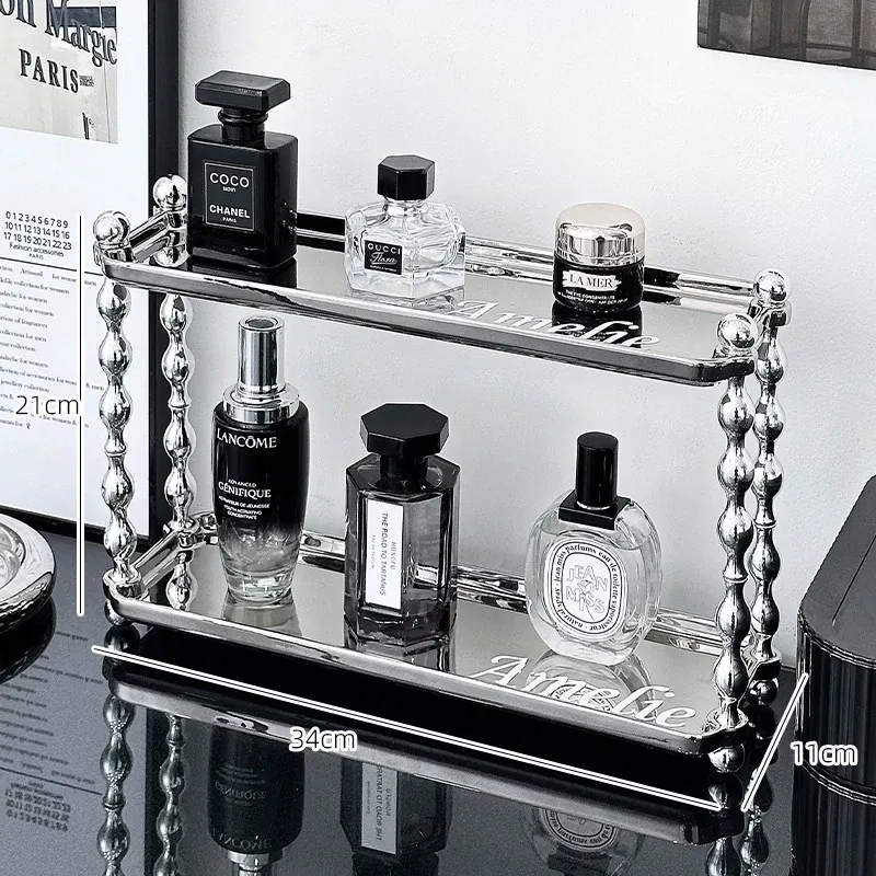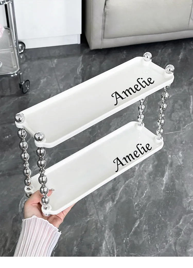 ラグジュアリー感あふれる化粧品収納ラック - ダブルレイヤーのセラミック製で、メイクアップやスキンケア、香水をスタイリッシュに整理!おしゃれなドレッサーにぴったりの高級感あるアイテムです。
