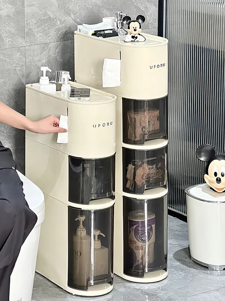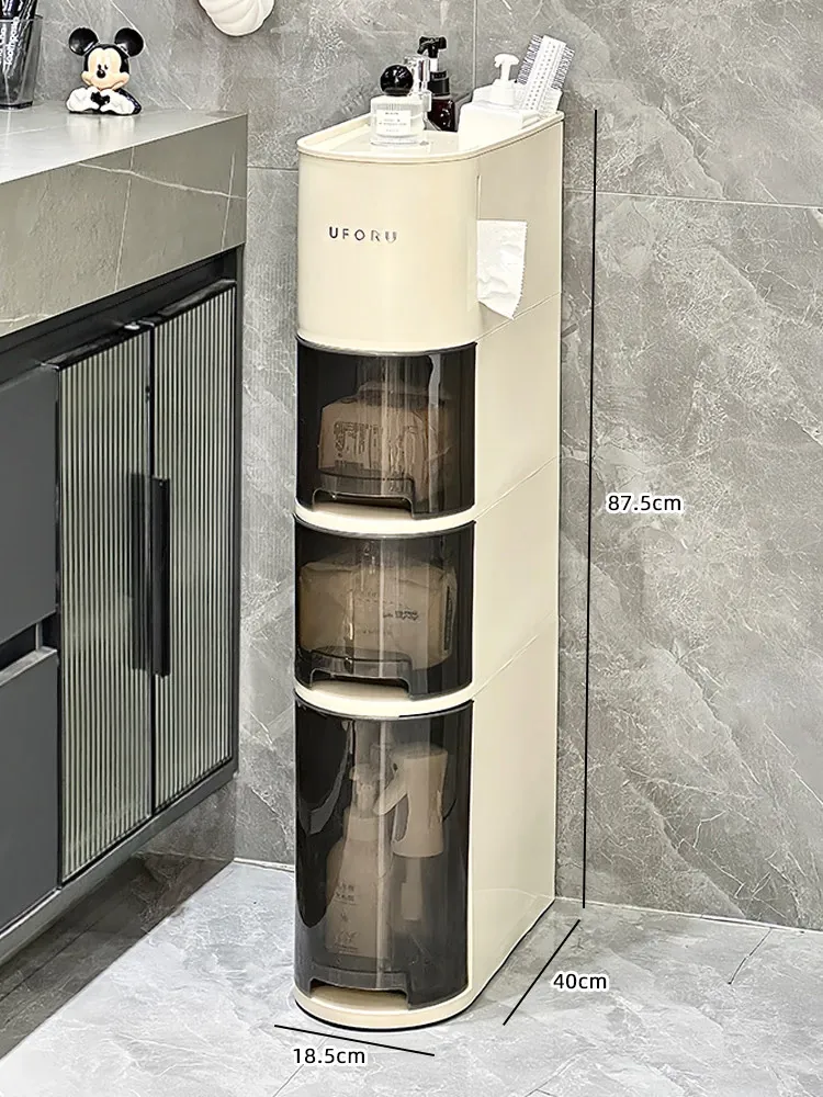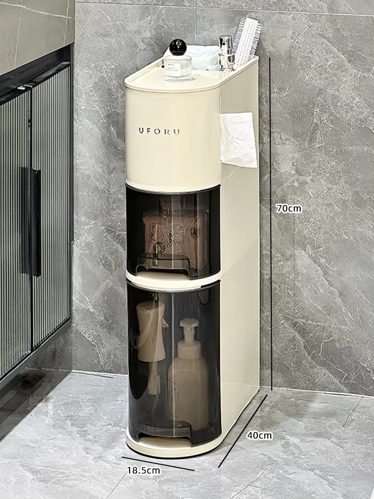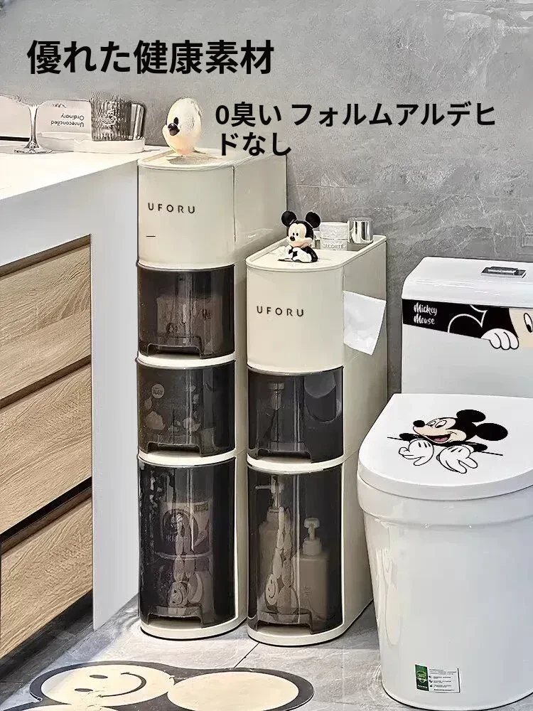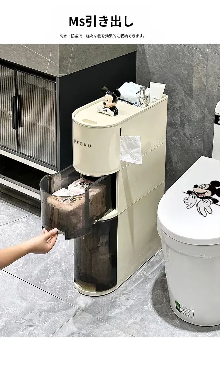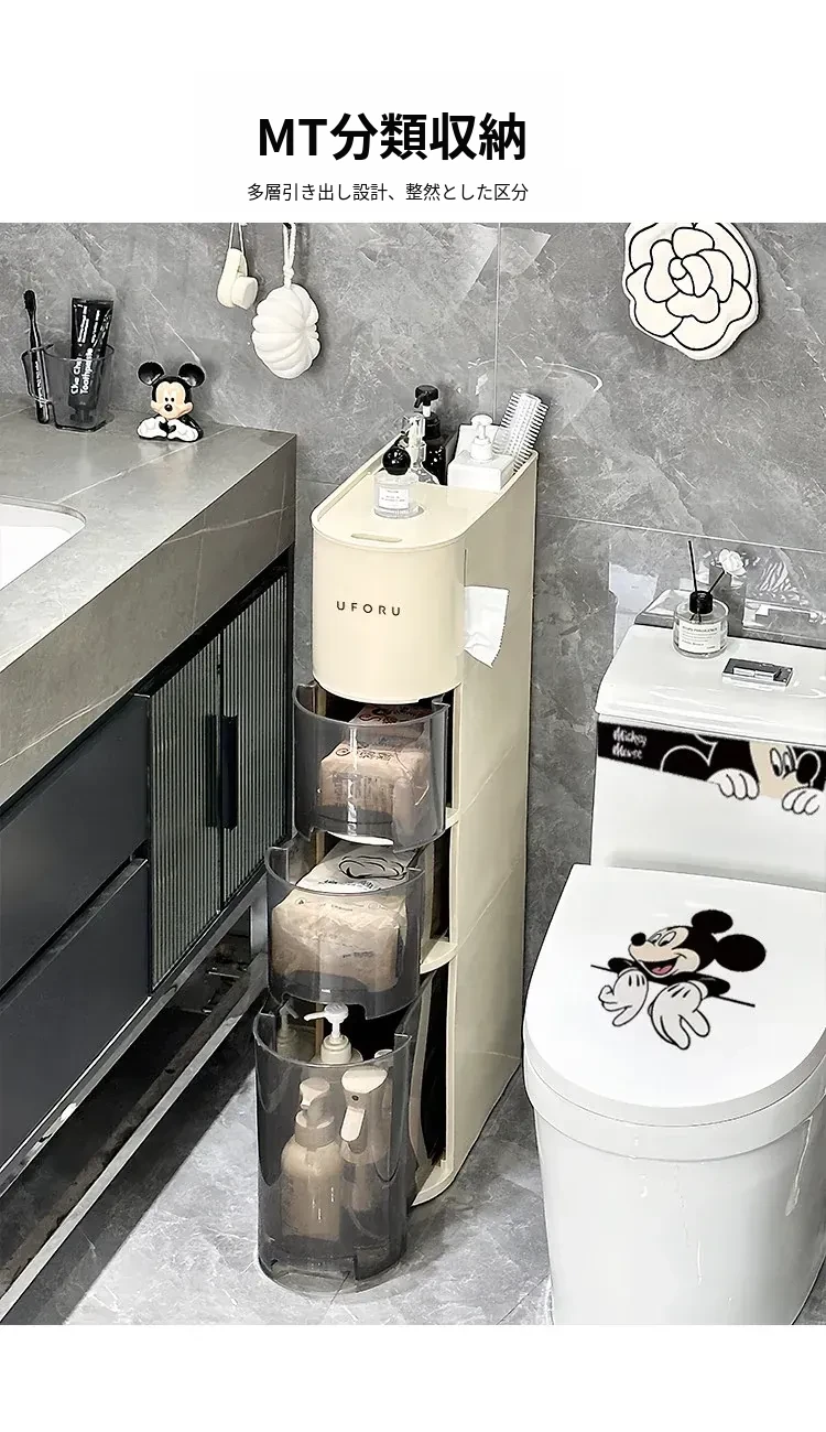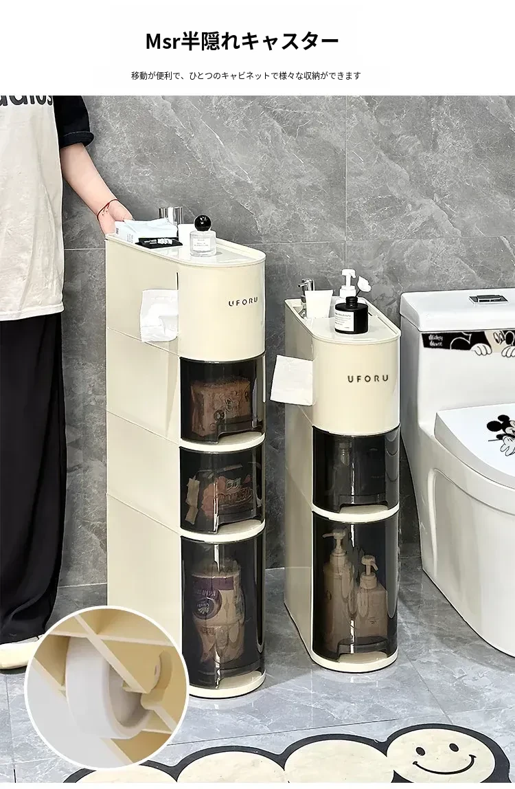 バスルーム用スリムキャビネット - トイレ横の省スペース収納!洗面所にぴったりなスタイリッシュなラックで、狭い隙間も無駄なく活用できます。整理整頓を簡単にし、あなたの生活空間を美しく演出します!