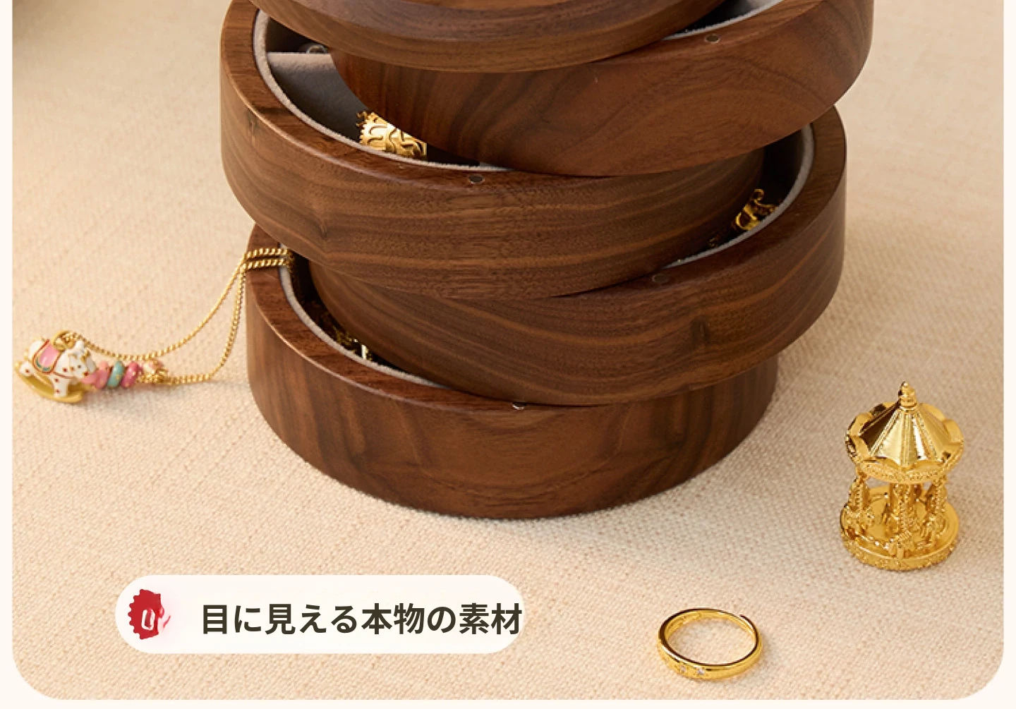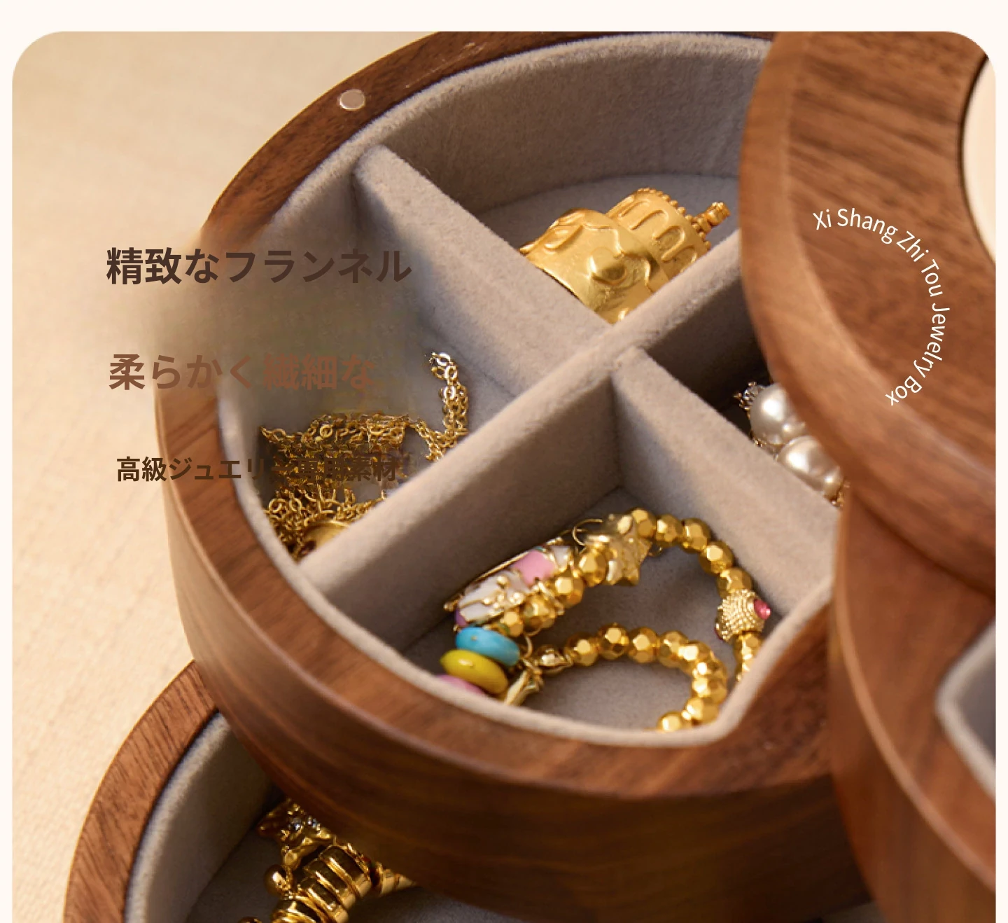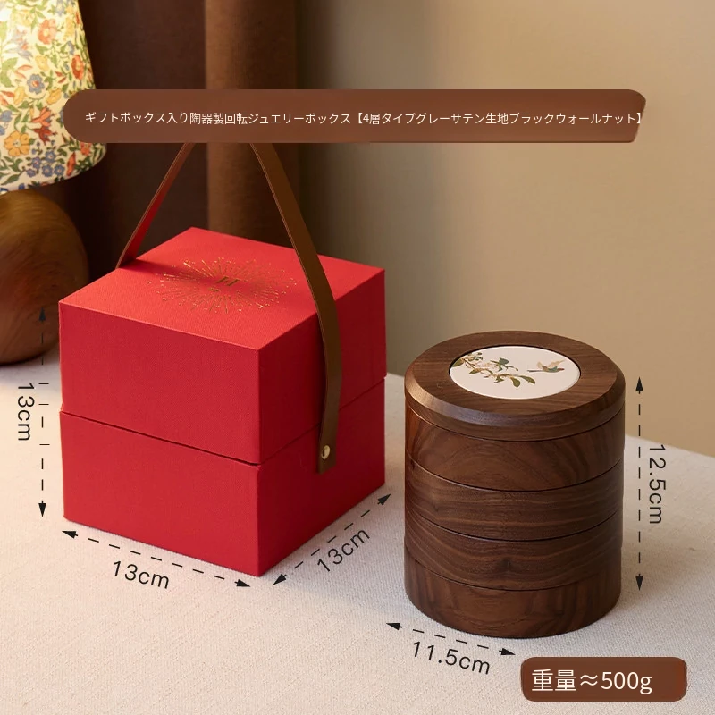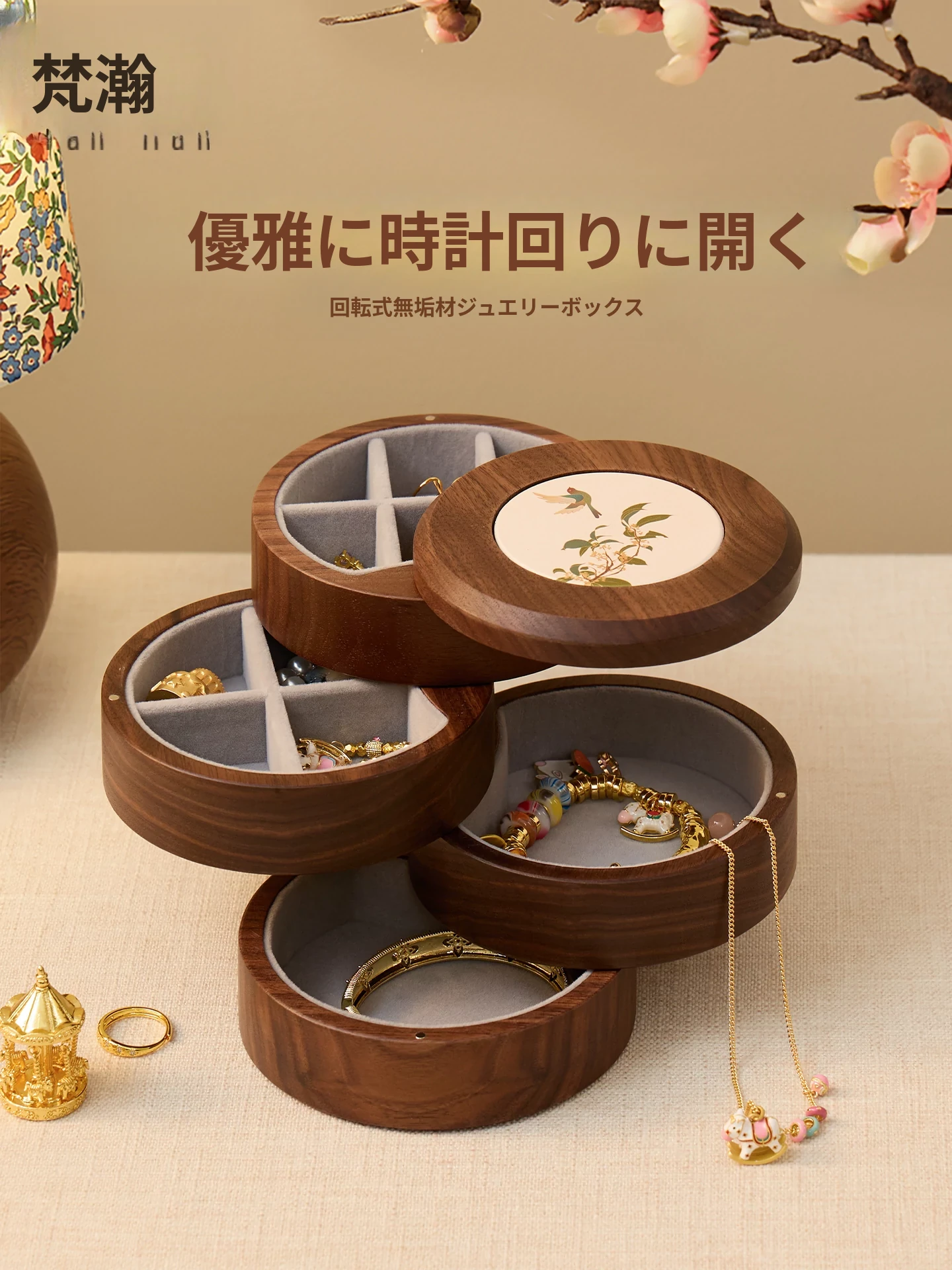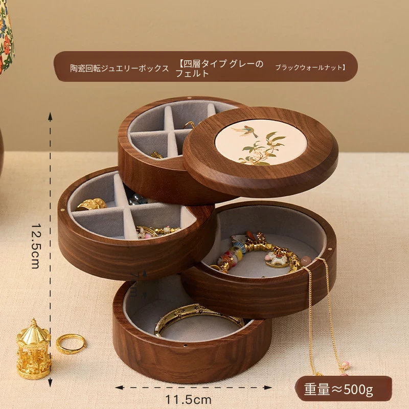 ヴァンハン 多層回転ジュエリーボックス 高級感溢れる無垢材製 結婚・新年・バレンタインに最適なゴールドアクセサリー収納ボックス