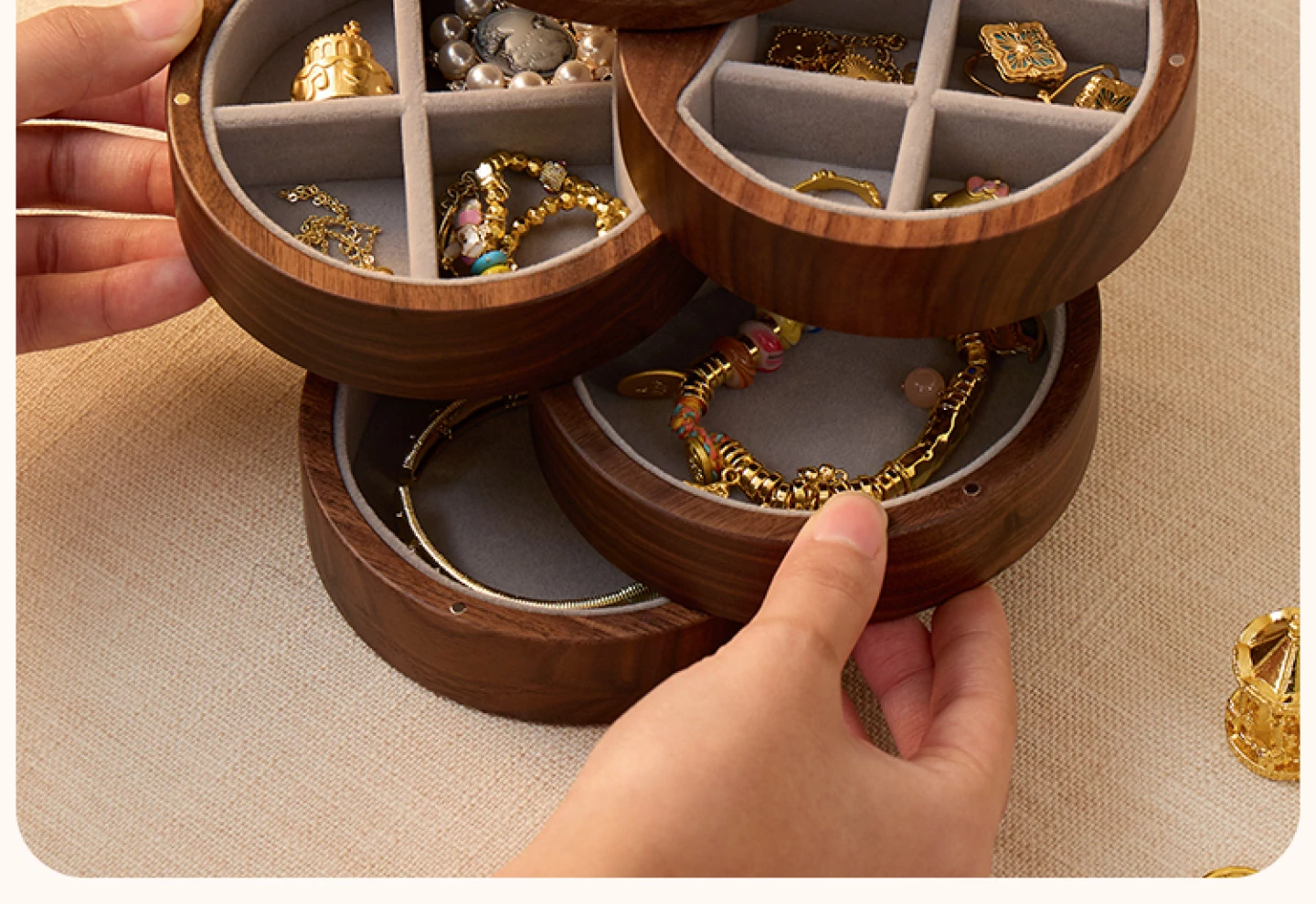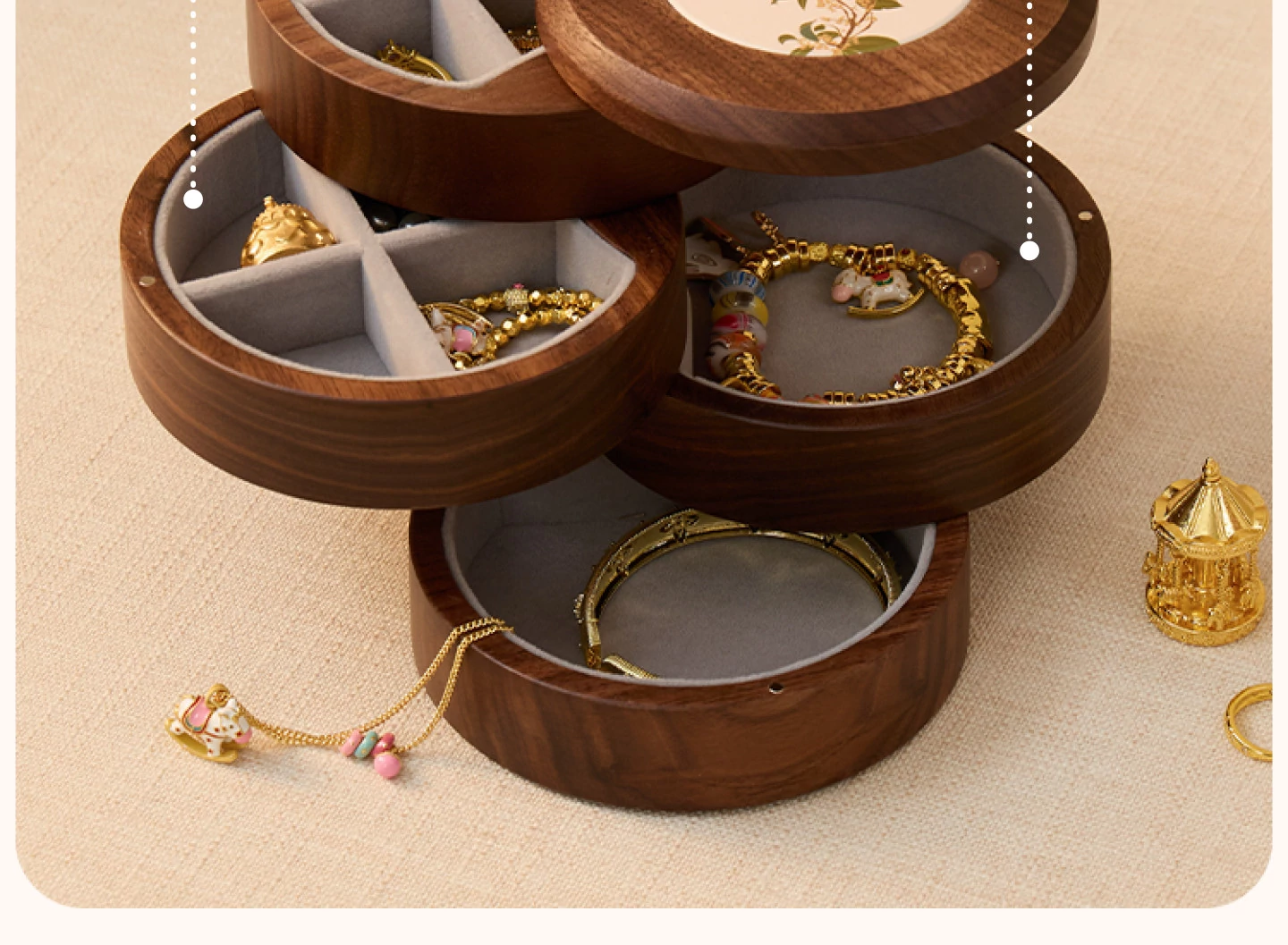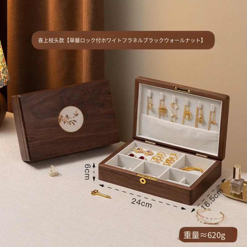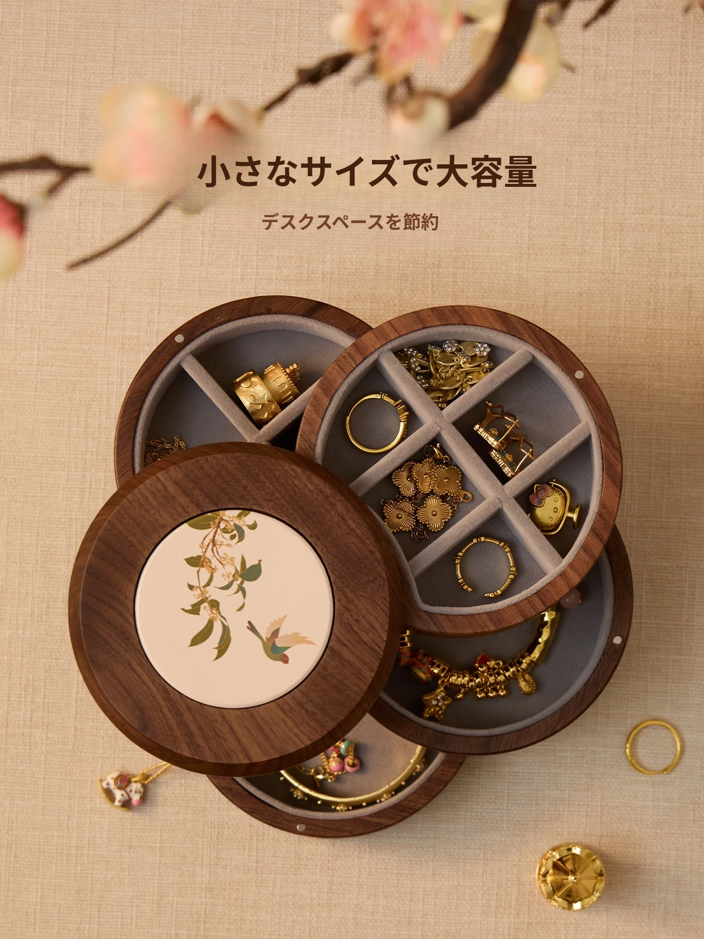 ヴァンハン 多層回転ジュエリーボックス 高級感溢れる無垢材製 結婚・新年・バレンタインに最適なゴールドアクセサリー収納ボックス