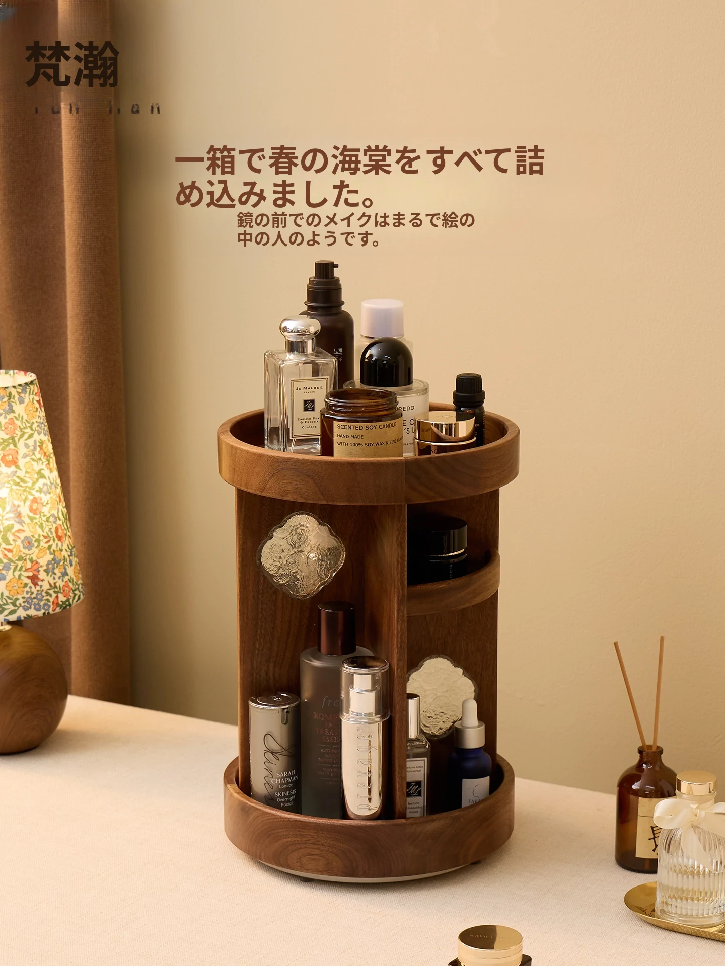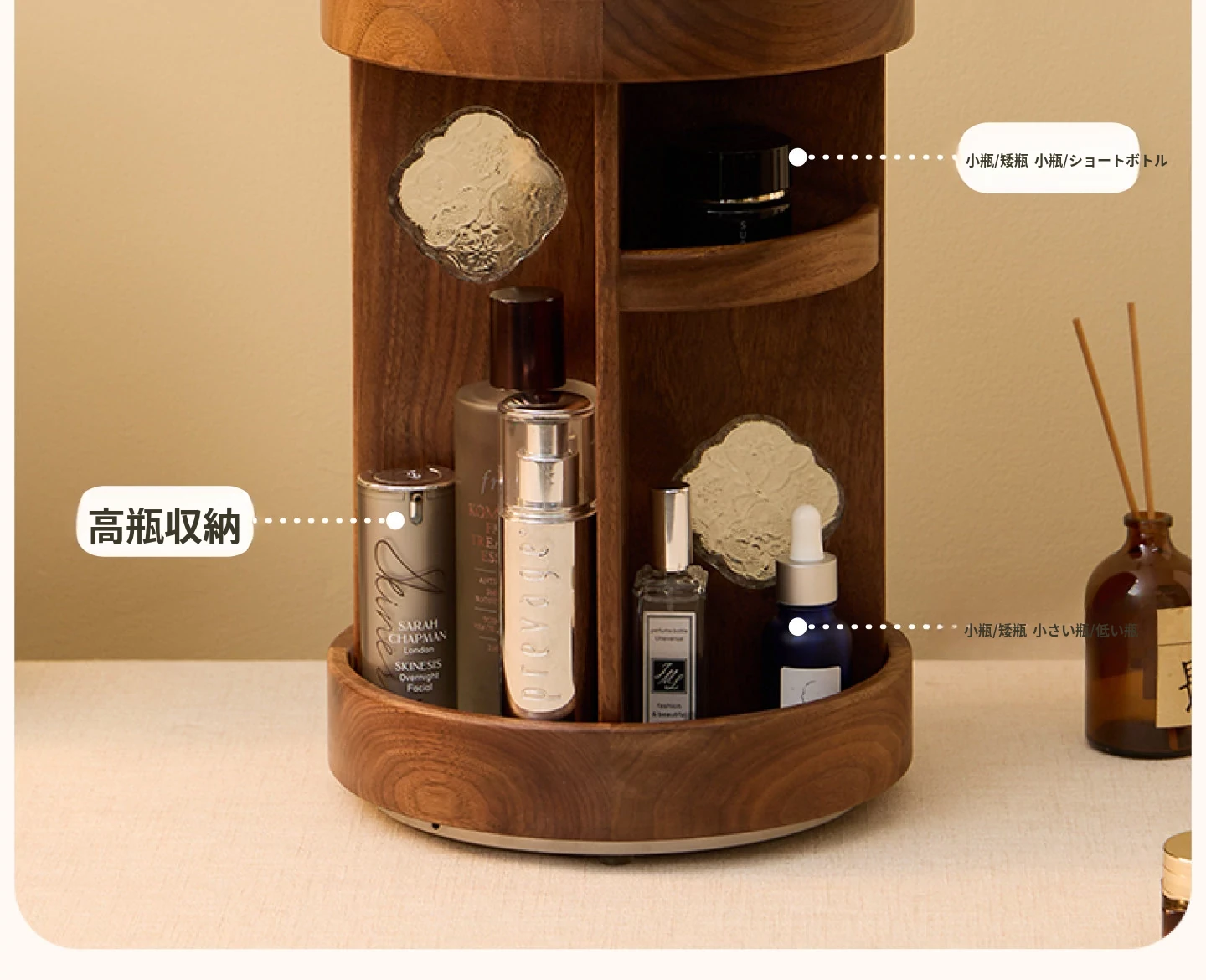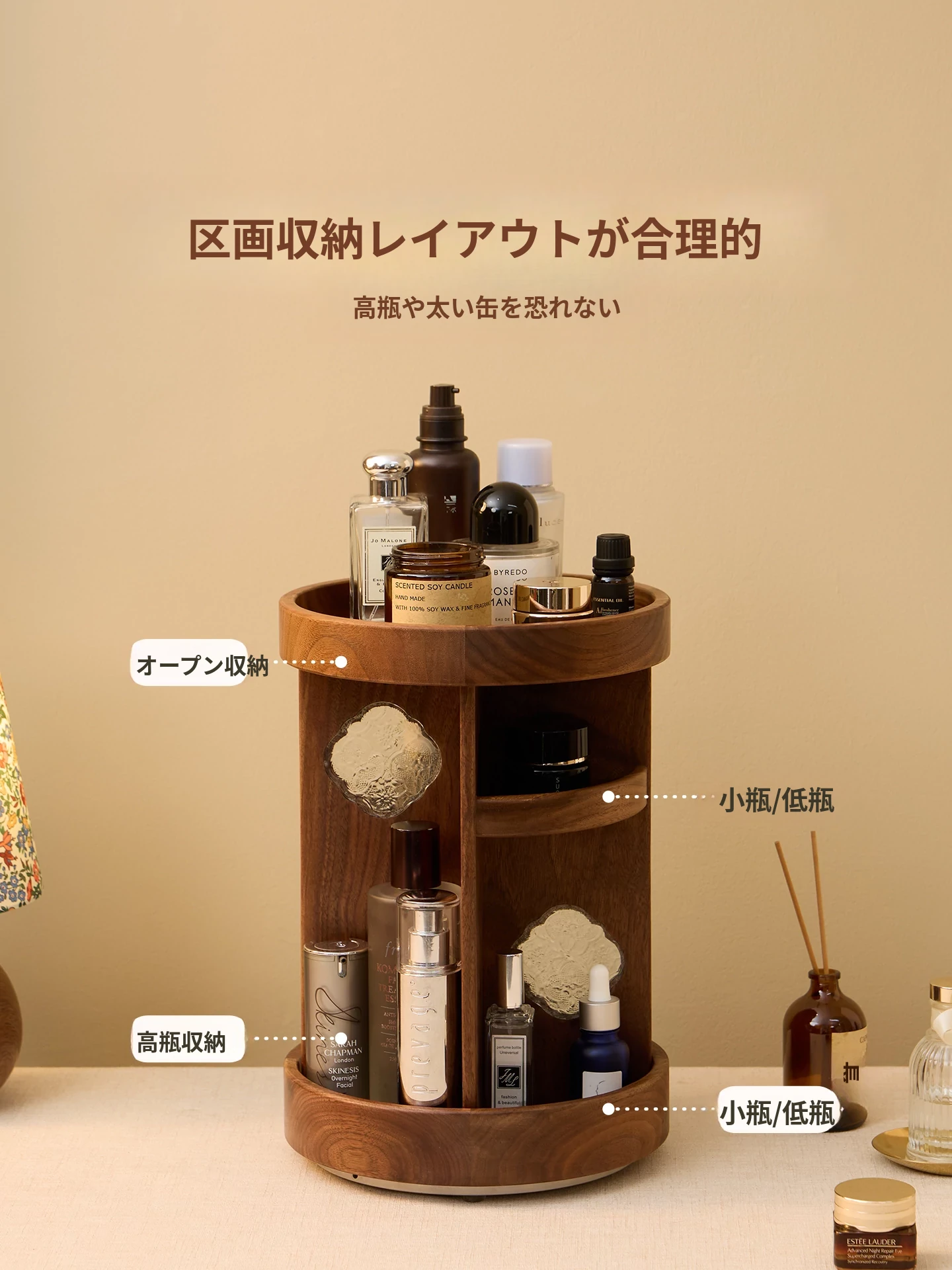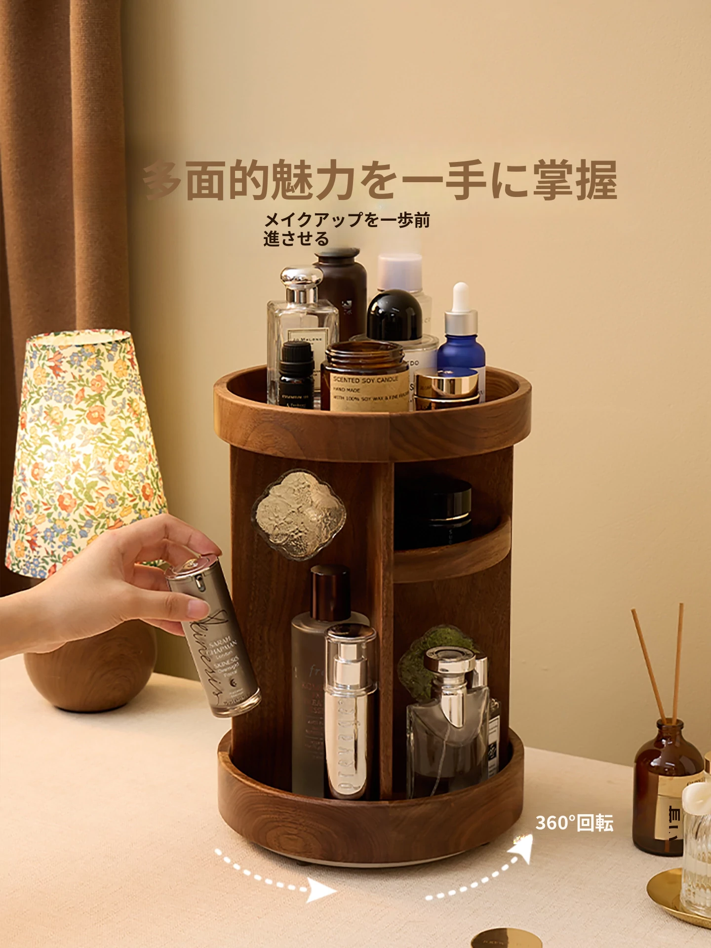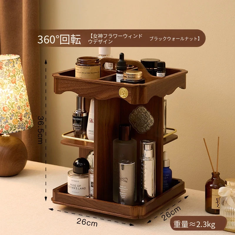 ヴァンハン ブラックウォールナット回転メイクボックス デスクトップ軽奢華収納ラック ドレッサー用スキンケアアイテム収納棚 - 高級感溢れるデザインで、あなたの美容アイテムをスタイリッシュに整理!