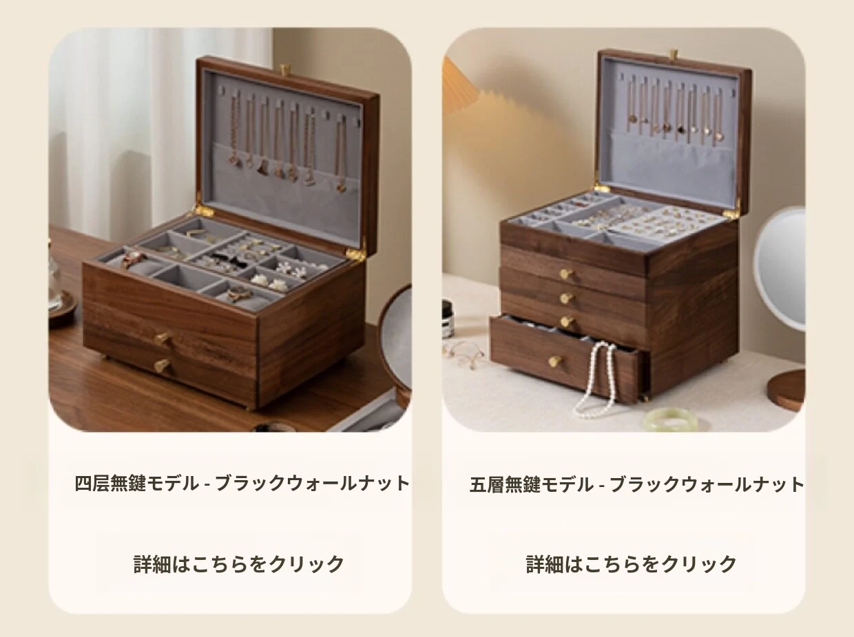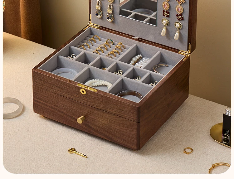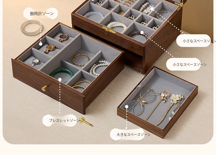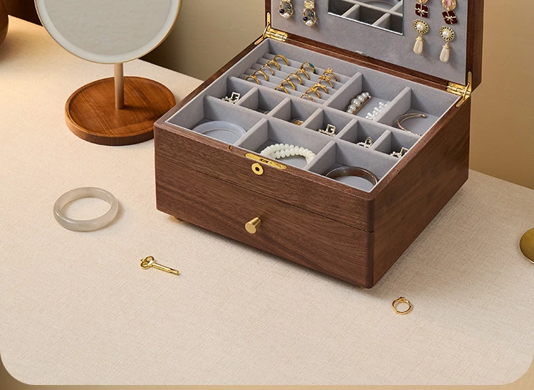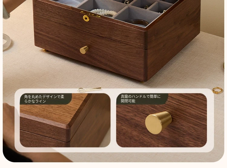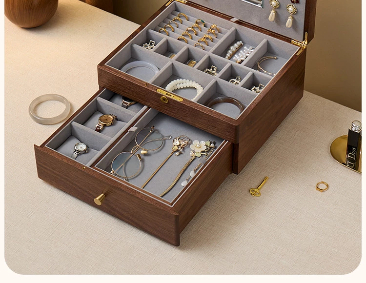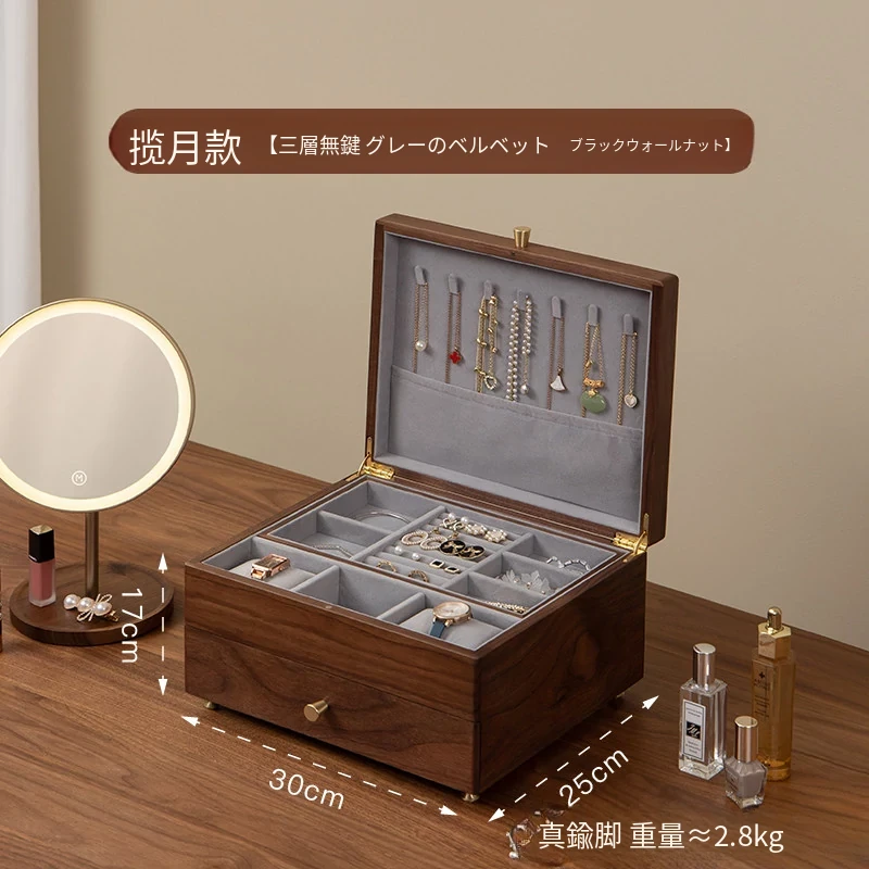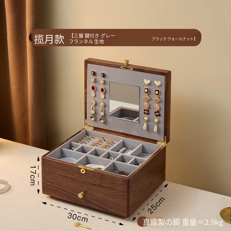 三段階のジュエリーボックス 鍵なし グレーのベルベット 北米産ブラックウォルナット