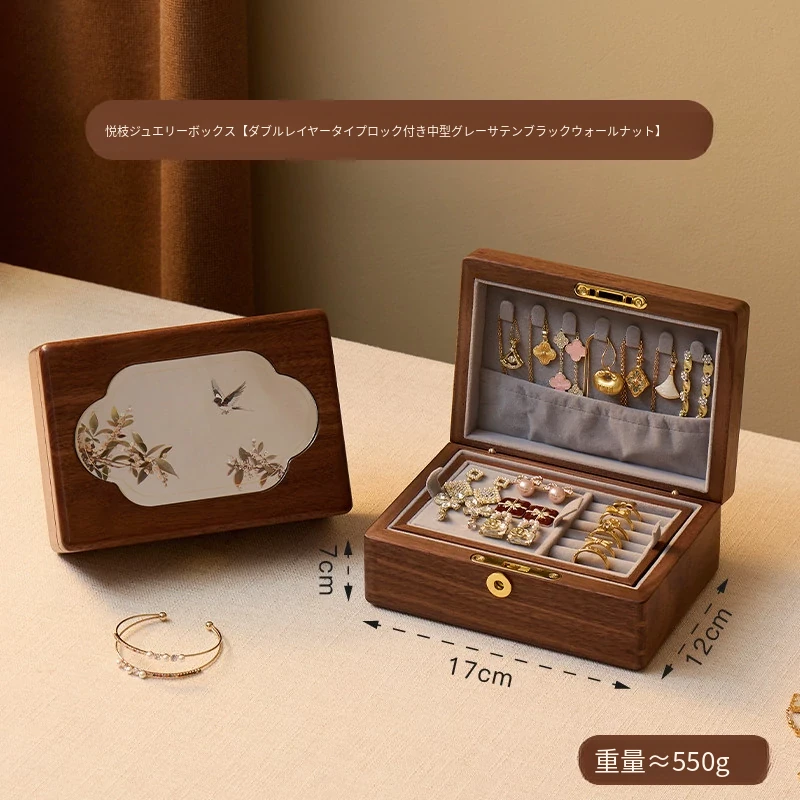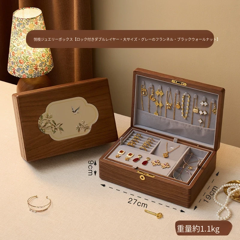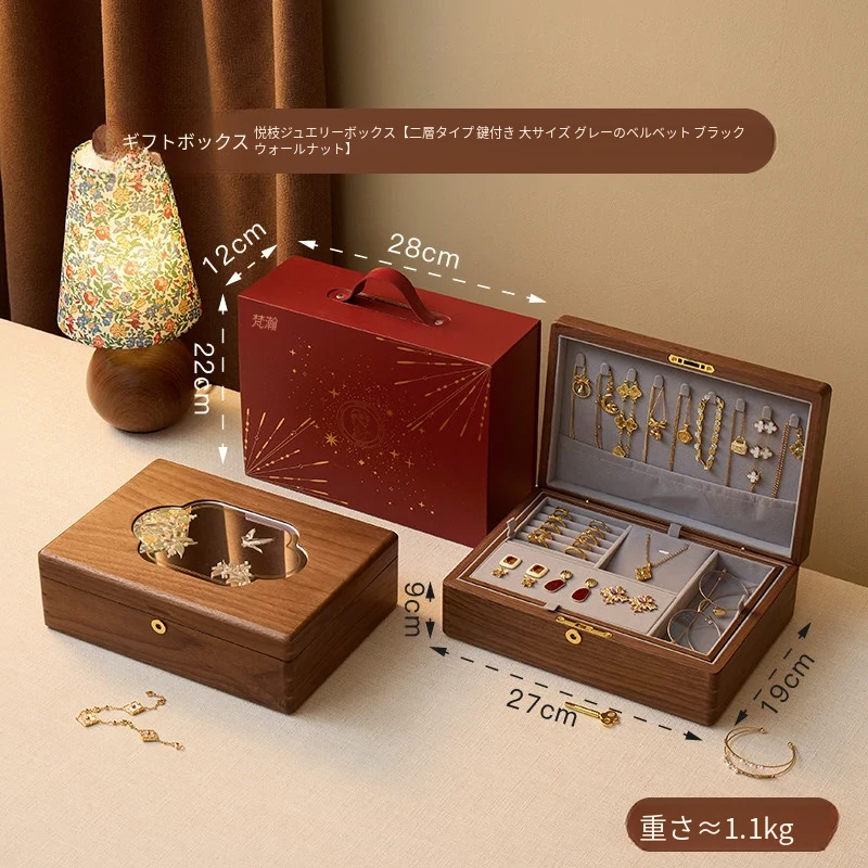 悦枝ジュエリーボックス 窓花 大サイズ 鍵付き グレーのフランネル 北米産ブラックウォルナット【ギフトボックス入り】