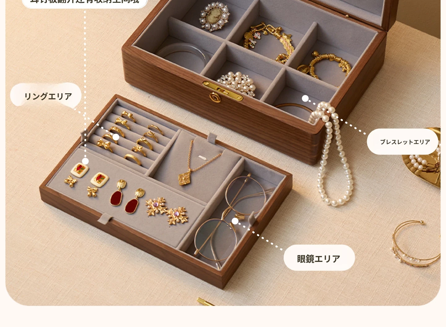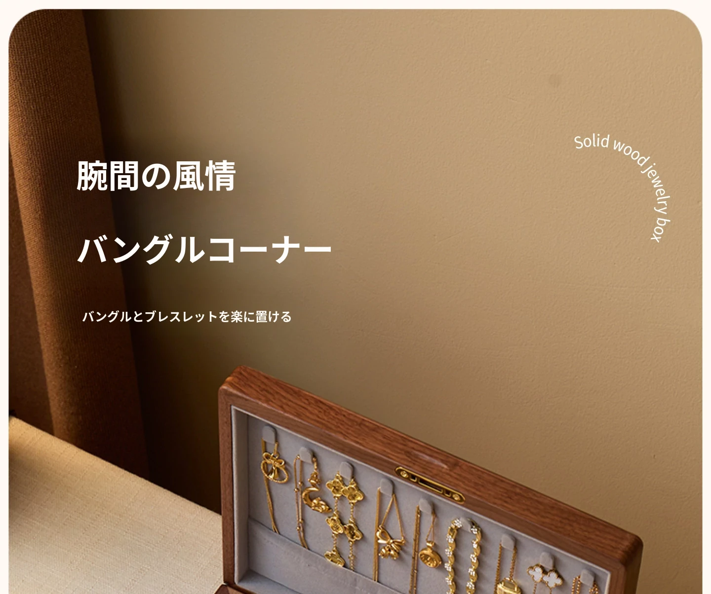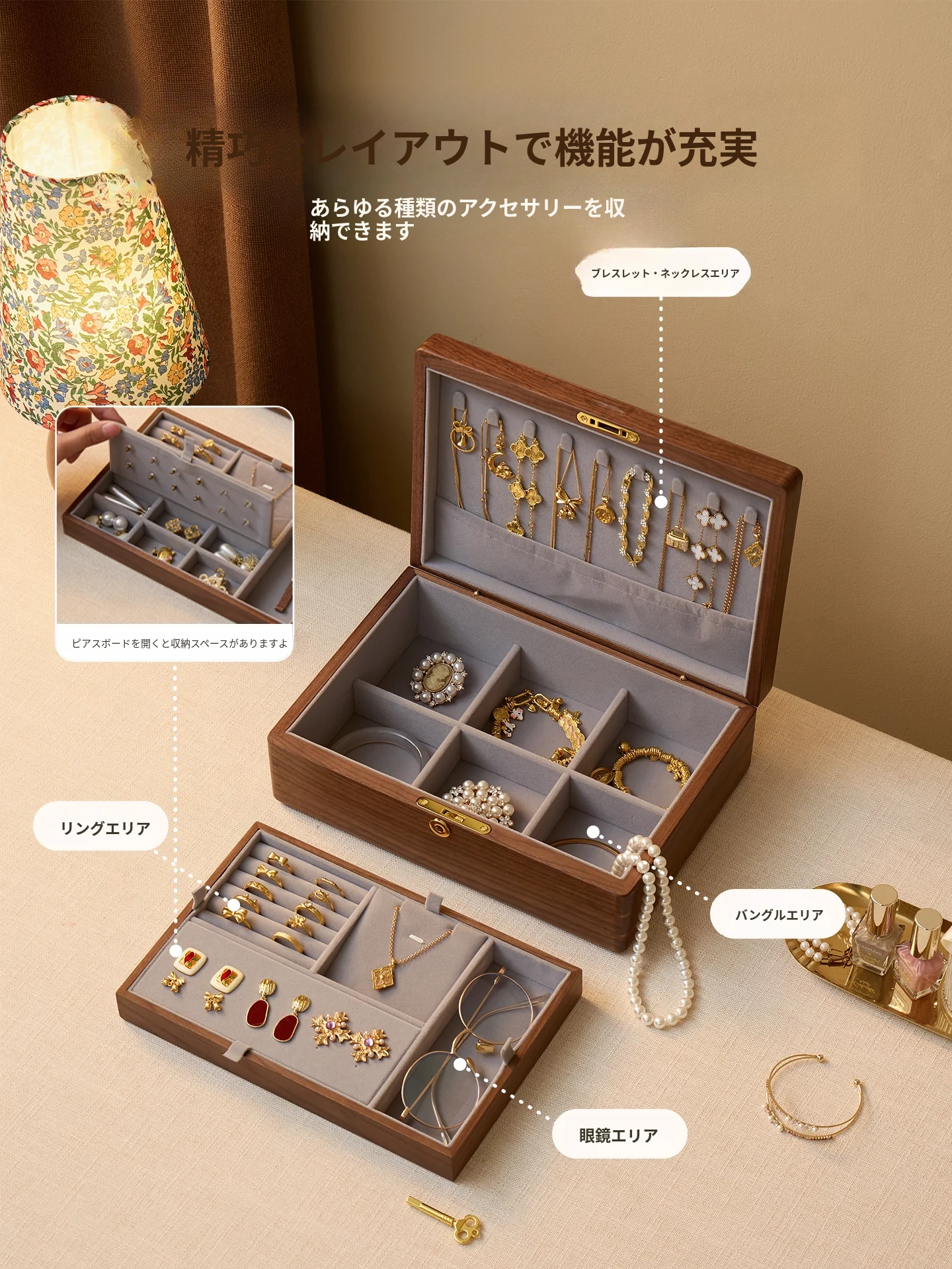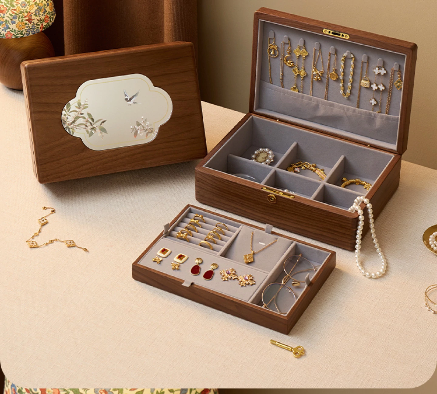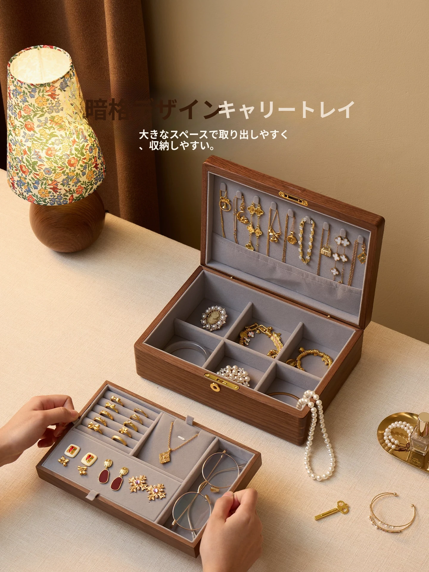 悦枝ジュエリーボックス 窓花 大サイズ 鍵付き グレーのフランネル 北米産ブラックウォルナット
