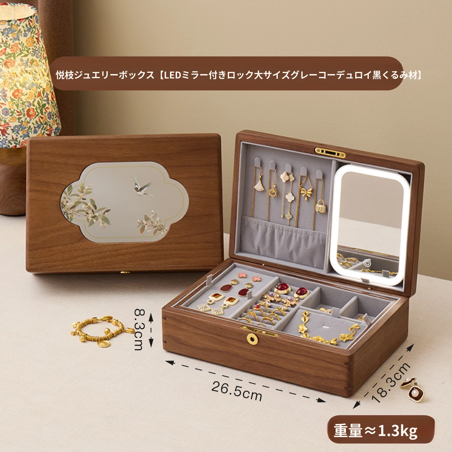 悦枝ジュエリーボックス 窓花 LEDタイプ 鍵付き グレーのフランネル 北米産ブラックウォルナット