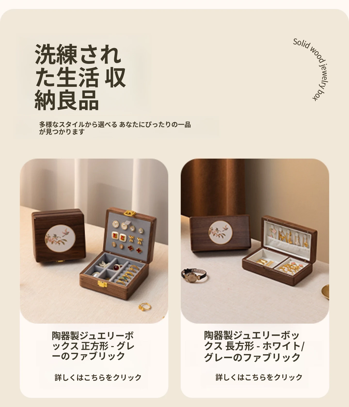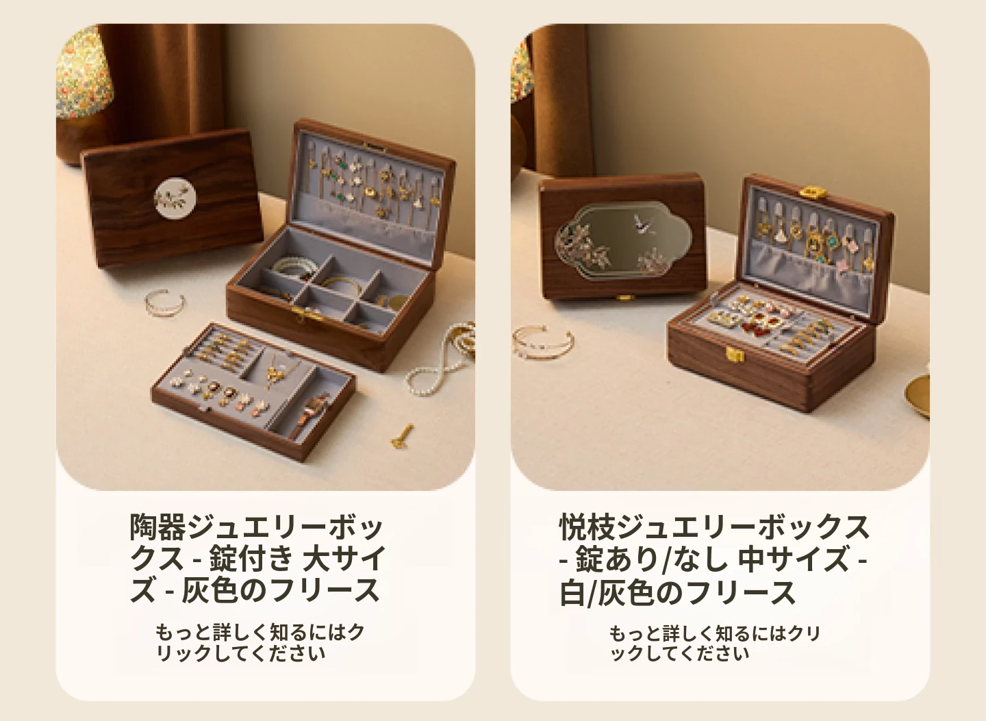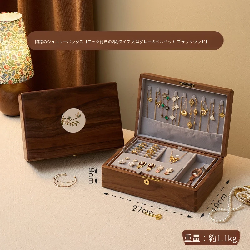 悦枝ジュエリーボックス 陶器 大サイズ 鍵付き グレーのフランネル 北米産ブラックウォルナット
