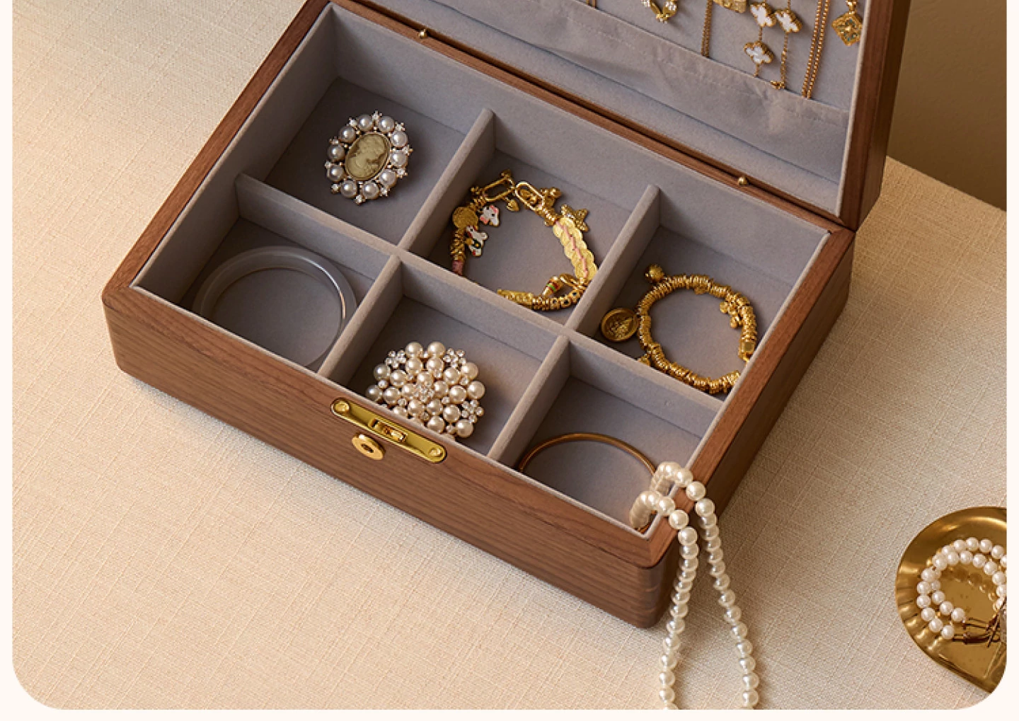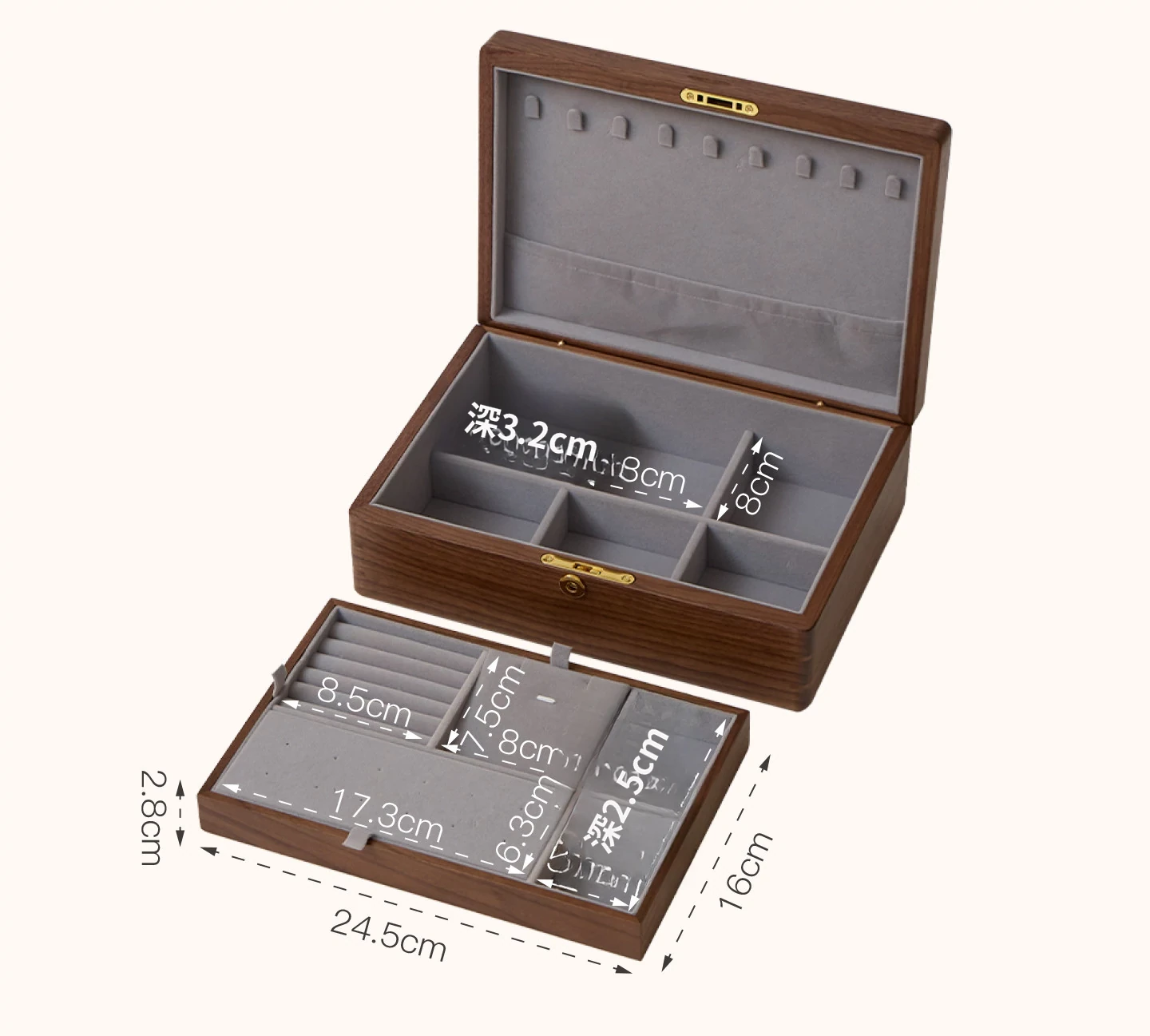 悦枝ジュエリーボックス 窓花 小サイズ 鍵付き グレーのフランネル 北米産ブラックウォルナット