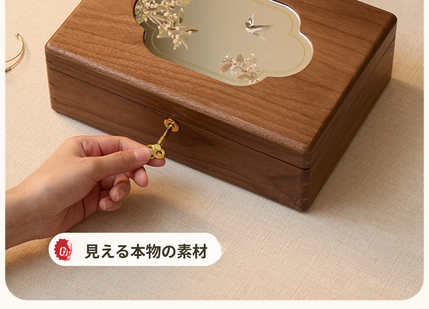 悦枝ジュエリーボックス 窓花 小サイズ 鍵付き 白のフランネル 北米産ブラックウォルナット