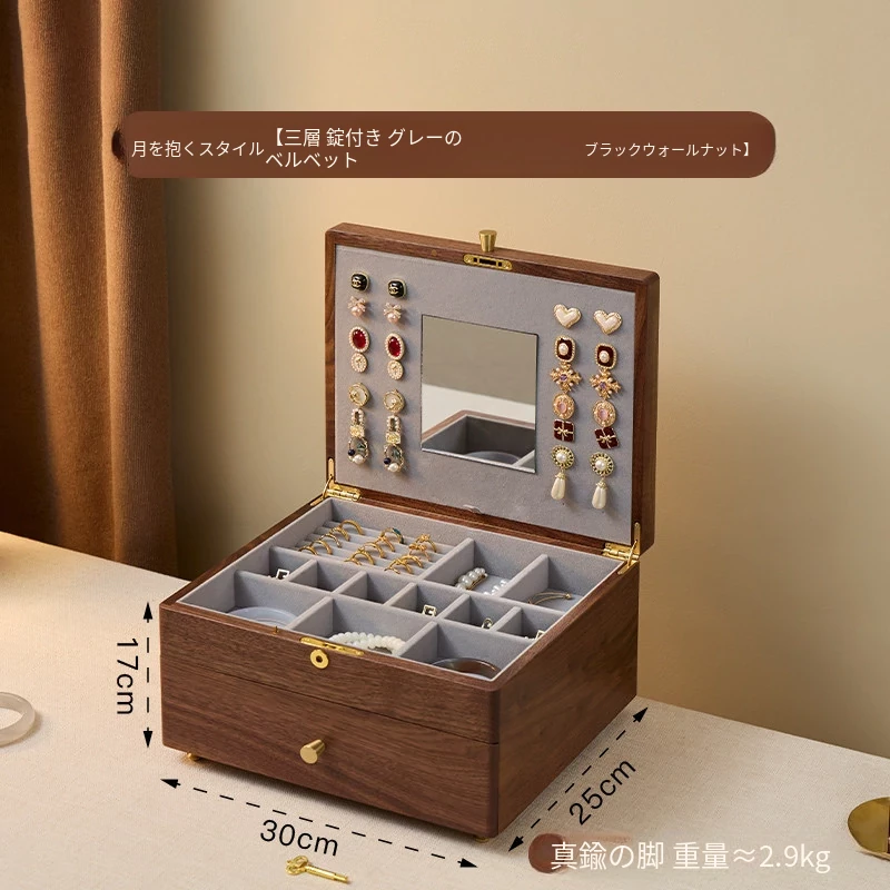 三層ジュエリーボックス 鍵付き グレーのベルベット 北米産ブラックウォールナット製