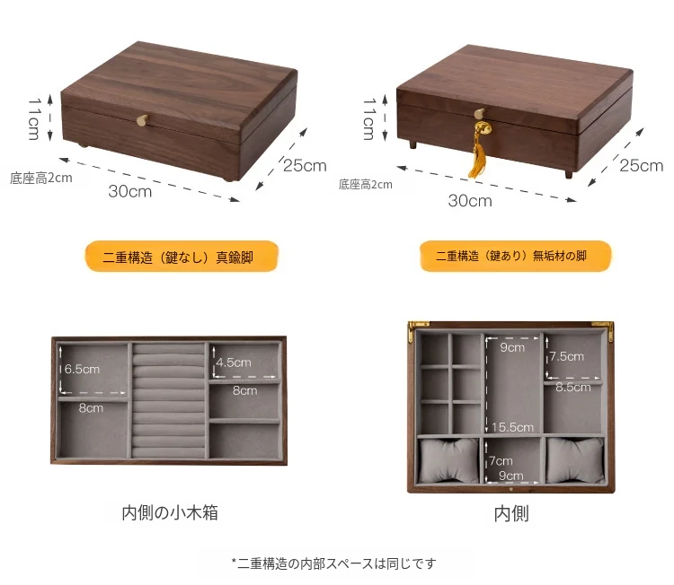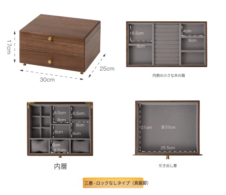 三層ジュエリーボックス 鍵なし グレーのベルベット 北米産ブラックウォールナット製