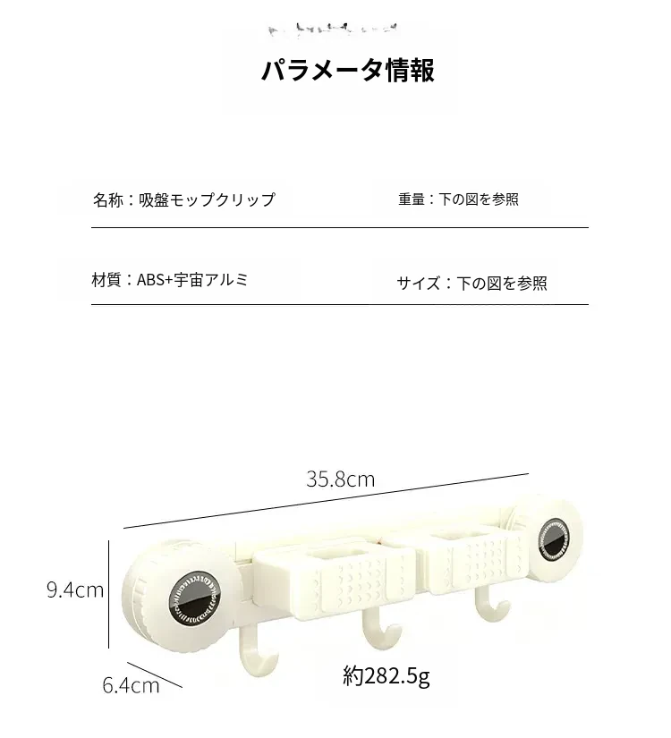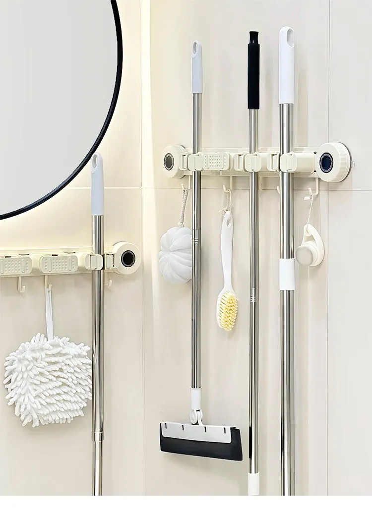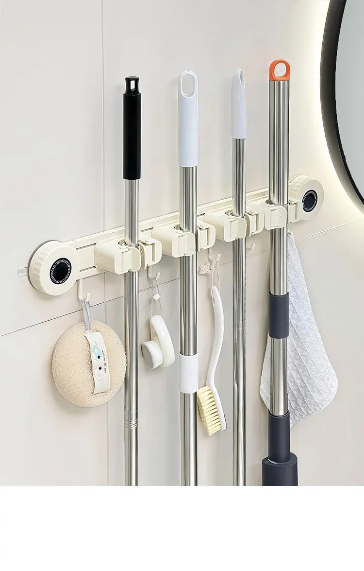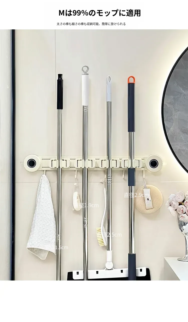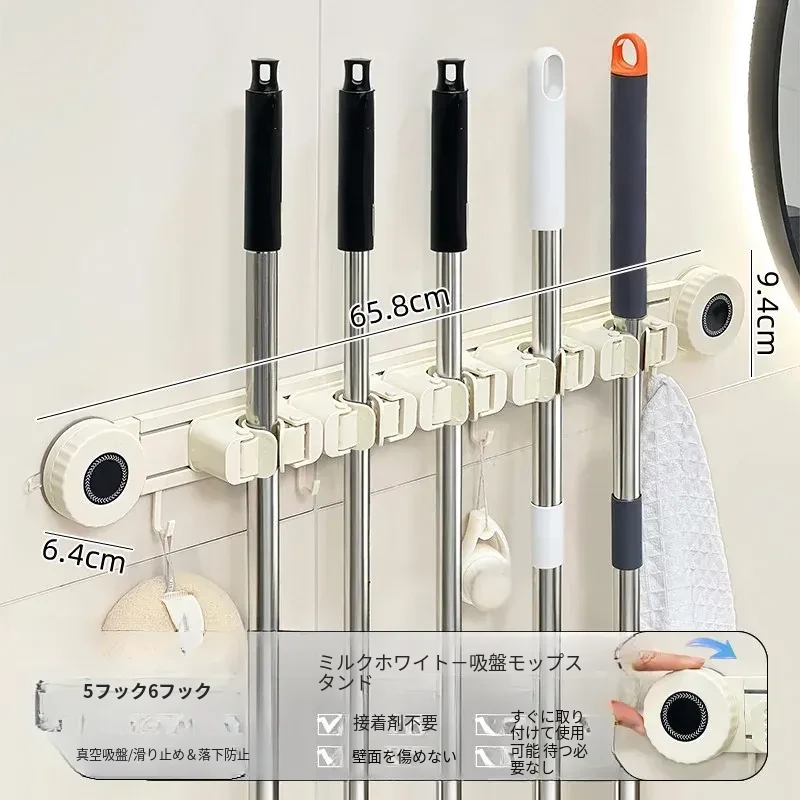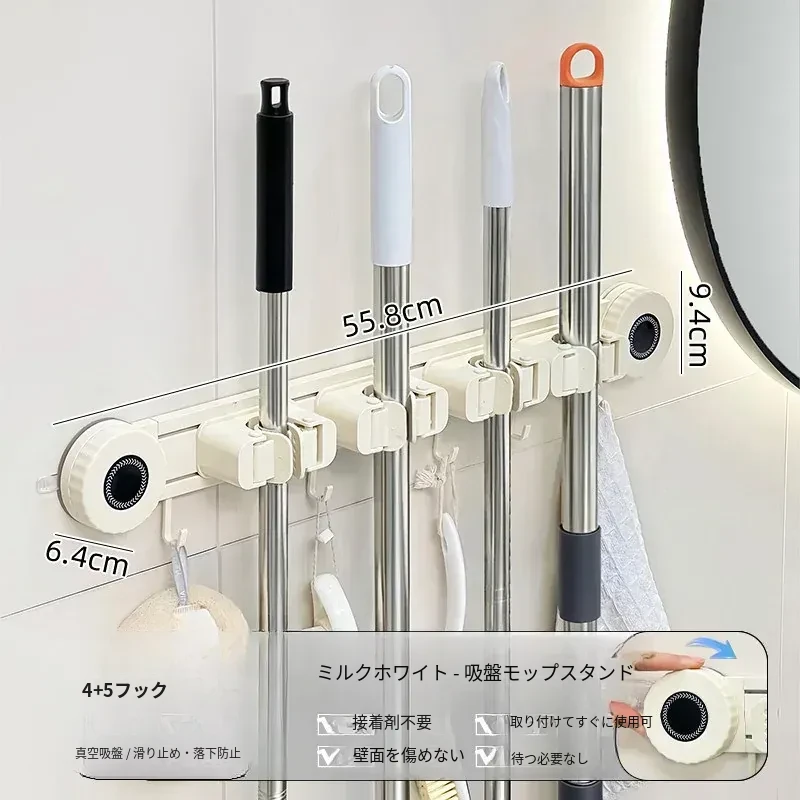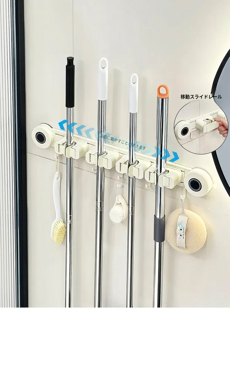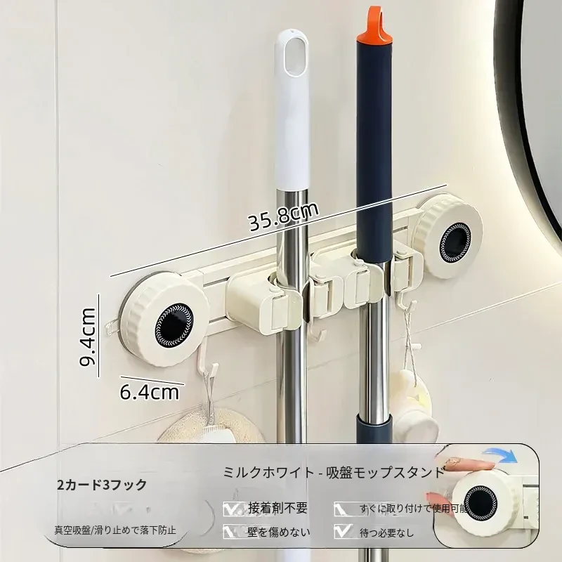 壁掛けモップホルダー - 吸盤式掃除道具掛け!穴あけ不要で簡単取り付け、キッチンやトイレの収納に最適な便利グッズ!おしゃれでスッキリ整理整頓、家庭必需品です!