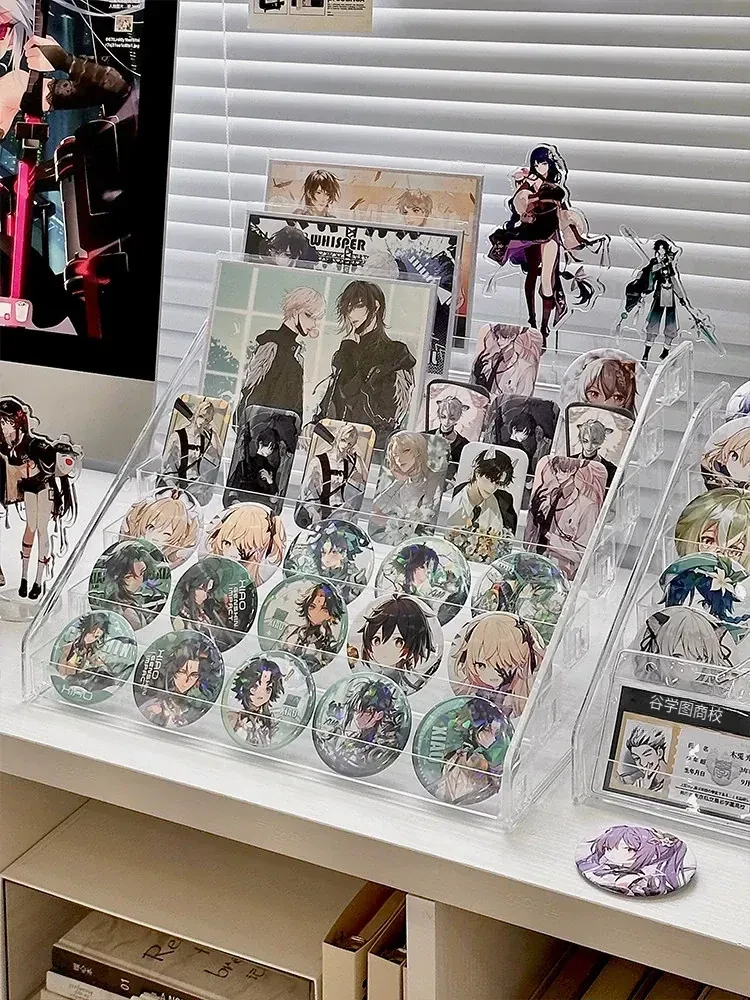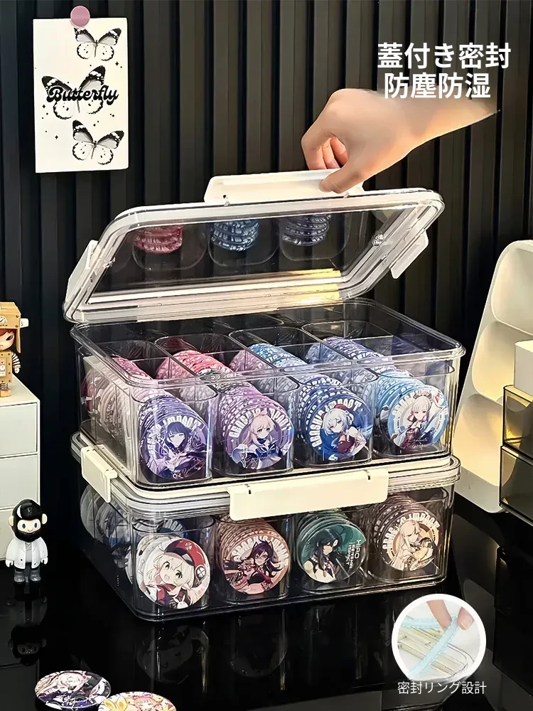 アクリル製透明仕切り付きバッジ収納ボックス - デスク周りを彩るアニメグッズの整理・保護に最適!あなたのコレクションを美しく展示しましょう!