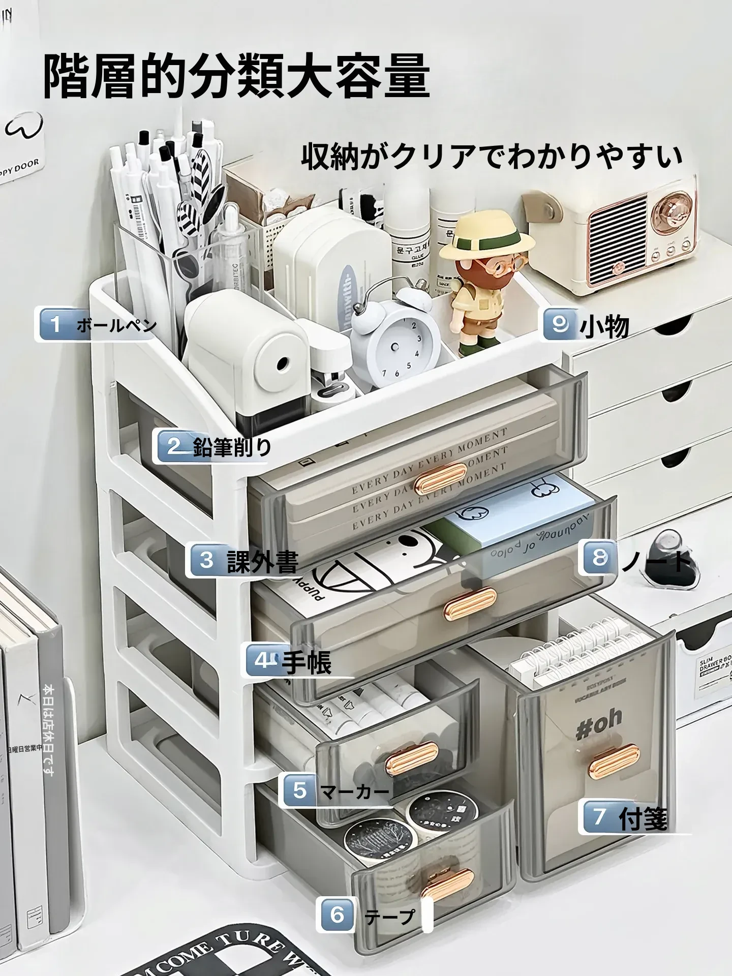 学生向けデスク用収納ボックス - 引き出し付きで文房具や小物を整理整頓!多層ラックデザインでオフィスや勉強スペースをスッキリ。使いやすくてスタイリッシュな収納アイテムです!