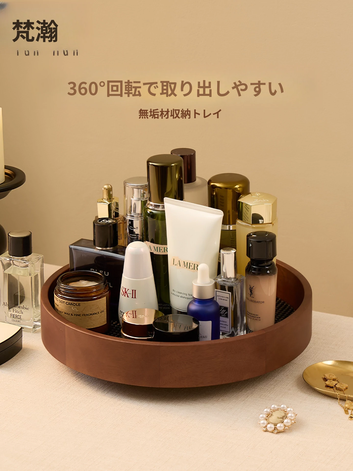 ヴァンハン 回転式化粧品収納ボックス 2025年新作 ウッドトレイ メイク台用 香水・スキンケアアイテム整理ラックで、スタイリッシュな空間を演出!