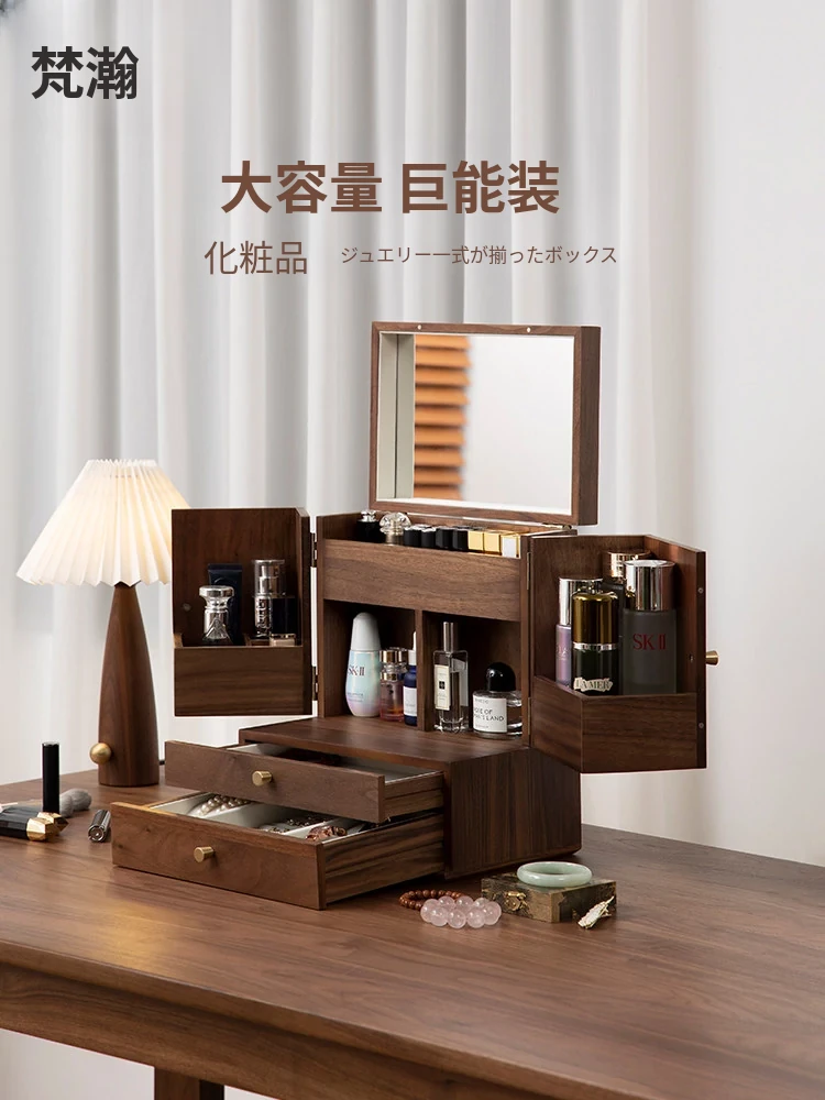 ヴァンハン木製大容量コスメ収納ボックス 鏡付き・防塵仕様 化粧デスク用 スキンケア&ジュエリーボックスで、美しさを引き立てる!