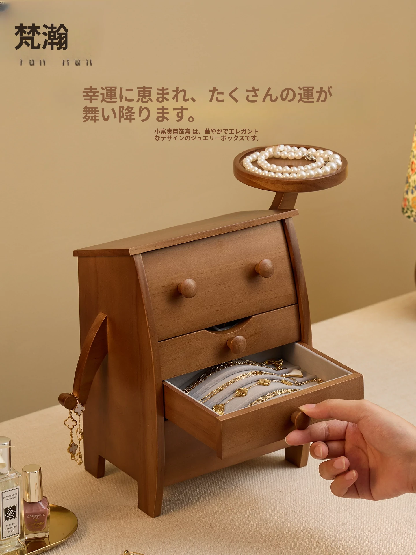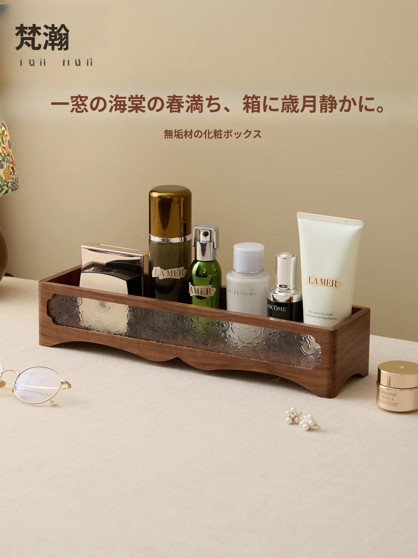 梵瀚のヴィンテージ風木製デスク収納ボックス - 化粧品や香水、スキンケア用品をスタイリッシュに整理!バスルームやデスク上にぴったりのアイテムです。美しさと機能性を兼ね備えた収納ラックで、毎日のルーティンをもっと楽しく!