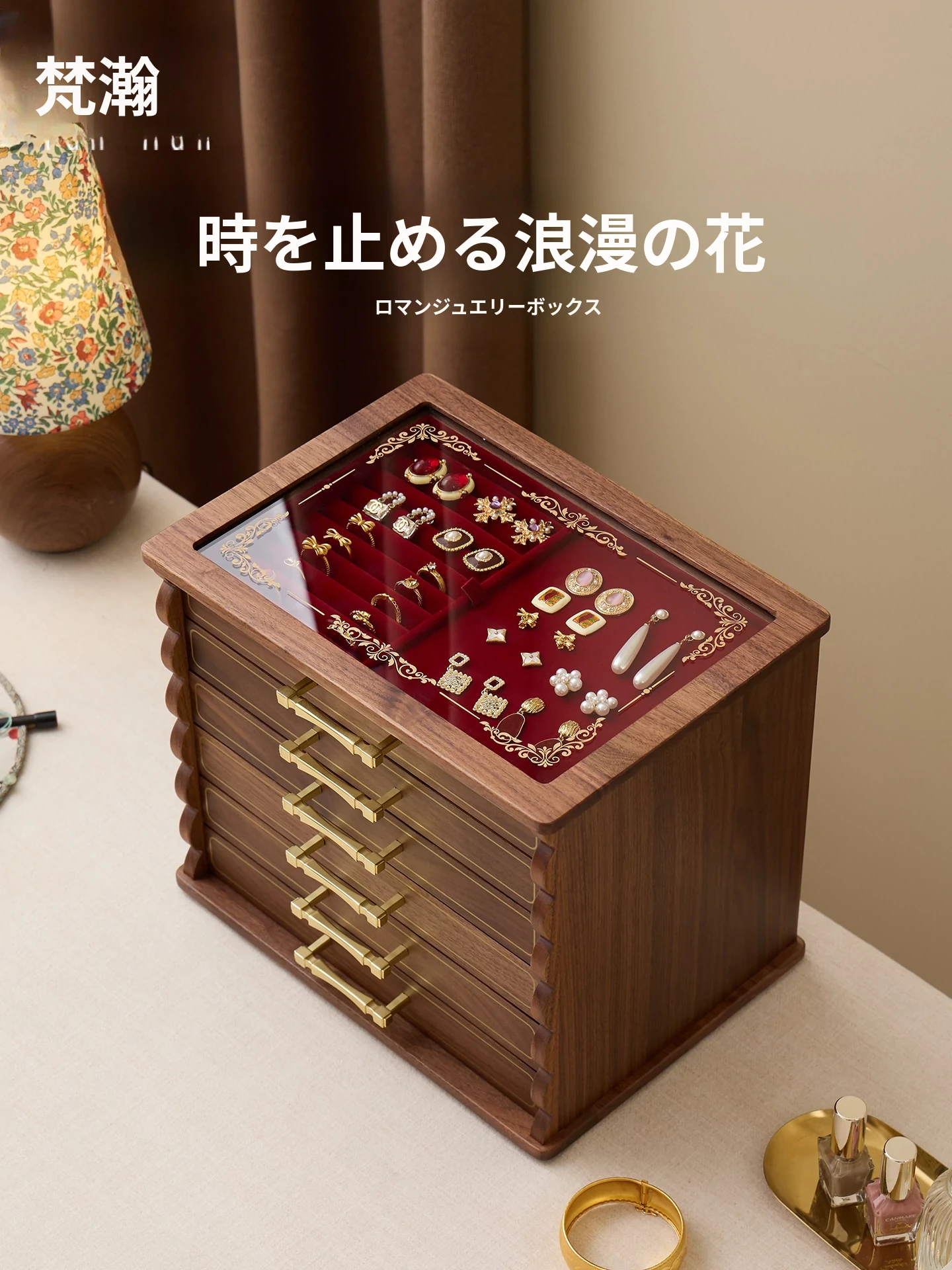 ヴァンハン 高級木製ジュエリーボックス 鏡付き・ロック付き 大切な友人への結婚祝い・春節ギフトに最適!宝石やアクセサリーの収納にぴったりな上品なデザイン。
