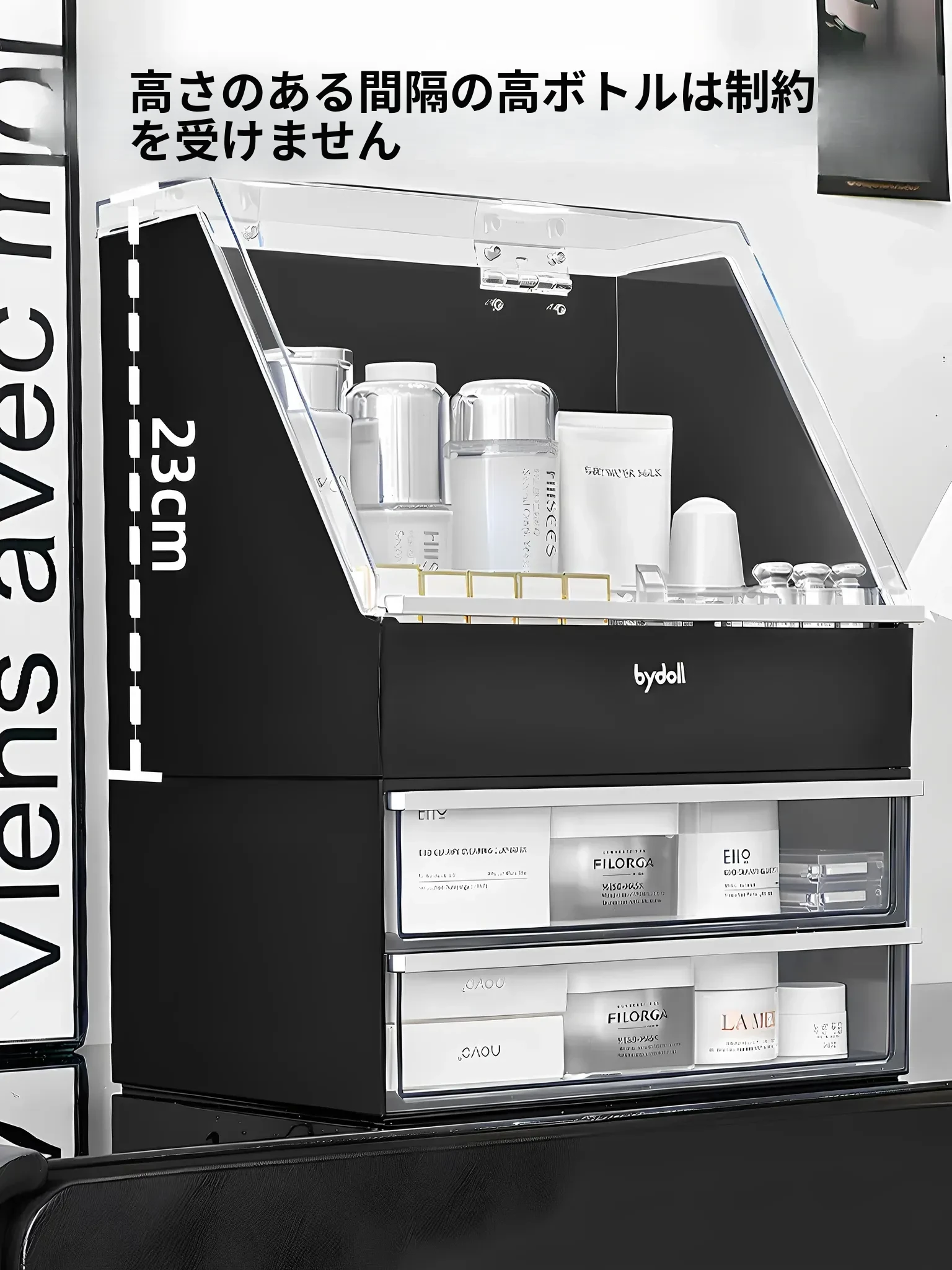 高級感溢れる化粧品収納ボックス|メイク台の必需品!スキンケアアイテムを整理するためのスタイリッシュなコスメボックス|口紅用仕切り付きで、すっきりとした収納を実現!