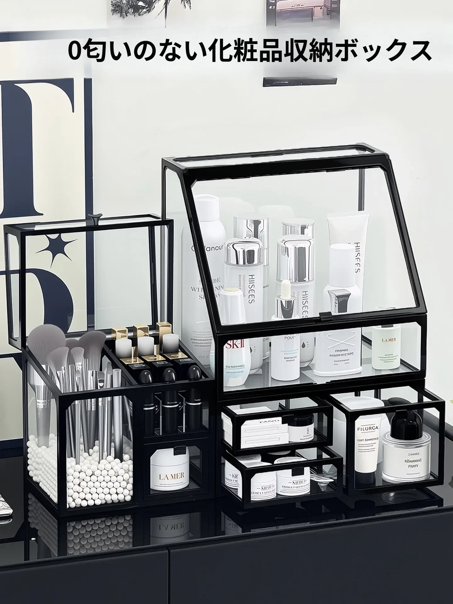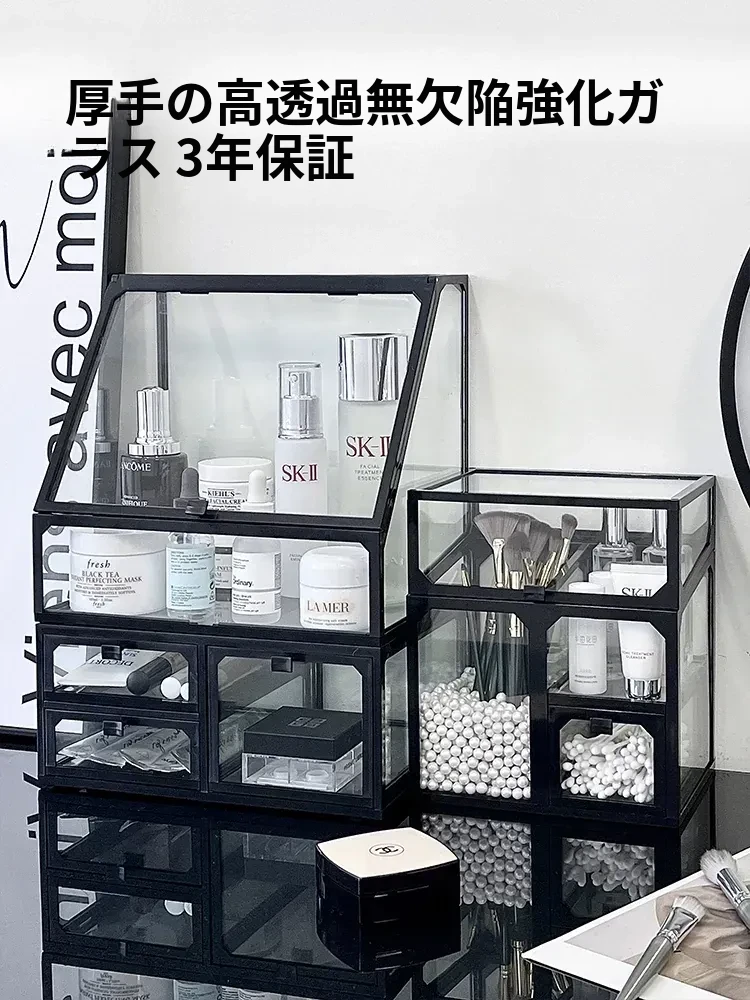 高級ガラス化粧品収納ボックス - ホコリを防ぎ、大容量でデスクトップに最適!口紅やスキンケア用品をスマートに整理できる美しいコスメディスプレイ。おしゃれで機能的な収納で、あなたのメイクアップタイムをもっと楽しく!