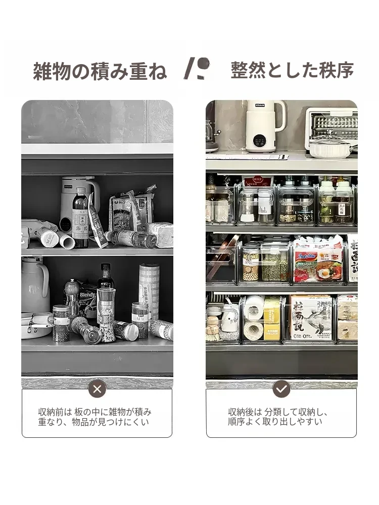 透明なキッチン収納ボックス - 引き出し式で伸縮可能!雑多な小物やスナックをスッキリ整理、水槽下や鍋置き場にも最適!あなたのキッチンをもっと便利に、美しく整えます!
